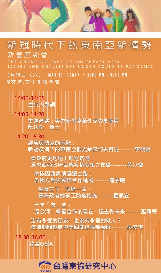 台灣東協研究中心(TASC)同仁近兩年追蹤、研析東協國家,在疫情下的政治、經濟、社會等領域,並於2021年12月出版《新冠時代下的東南亞新情勢》之電子書,期待以淺顯易懂的敘事方式,協助讀者啟發對東南亞相關議題的興趣。
