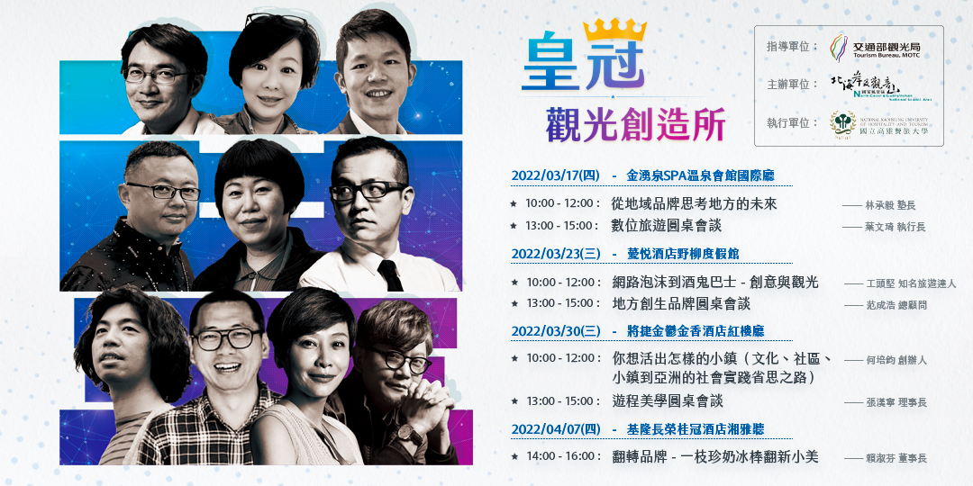 4場皇冠觀光創造所、3場主題圓桌會談,從觀光、品牌、遊程、美學等多個面向進行經驗講座及實務對談,期望透過產業界專家的分享,以接收新想法及輸出對談的方式,激發業者對於此時此刻努力的事情有更多不同的看法,也希望因這樣的場合而聚集多家業者,能建立更多樣化的連結。
