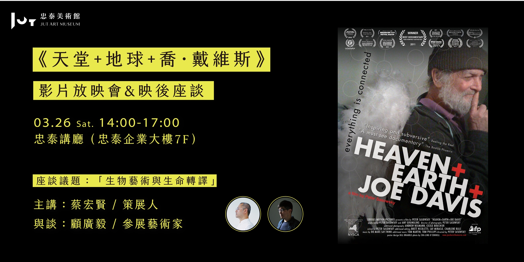 本場次結合影片放映會及映後座談,由美國導演彼得.薩索斯基獨立拍攝的紀錄片《天堂+地球+喬.戴維斯》,獲得舊金山獨立製片電影節和曼菲斯獨立製片電影節獎項肯定,內容紀錄了被譽為「生物藝術之父」的怪才藝術家喬.戴維斯一路透過科學與藝術等複合方式的生命探索歷程;本活動邀請展覽策展人蔡宏賢及參展藝術家顧廣毅於映後針對影片內容及「生物藝術與生命轉譯」議題進行座談,引領觀眾從戴維斯自身的文化背景出發,透過顧廣毅的作品《酷兒白蟻計畫》,分享文化轉譯、存儲、傳遞,進一步藉由藝術提出對生命意義的探索與思考。