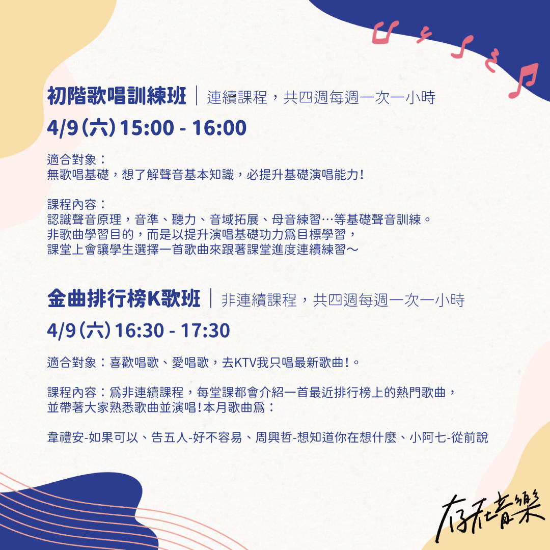 - 初階歌唱訓練班|4/9(六)15:00 - 16:00,連續四週