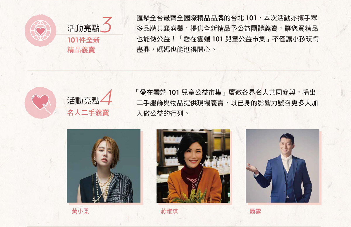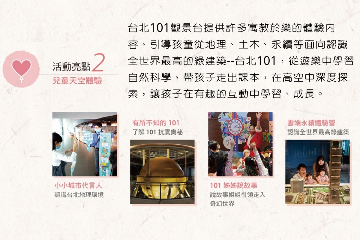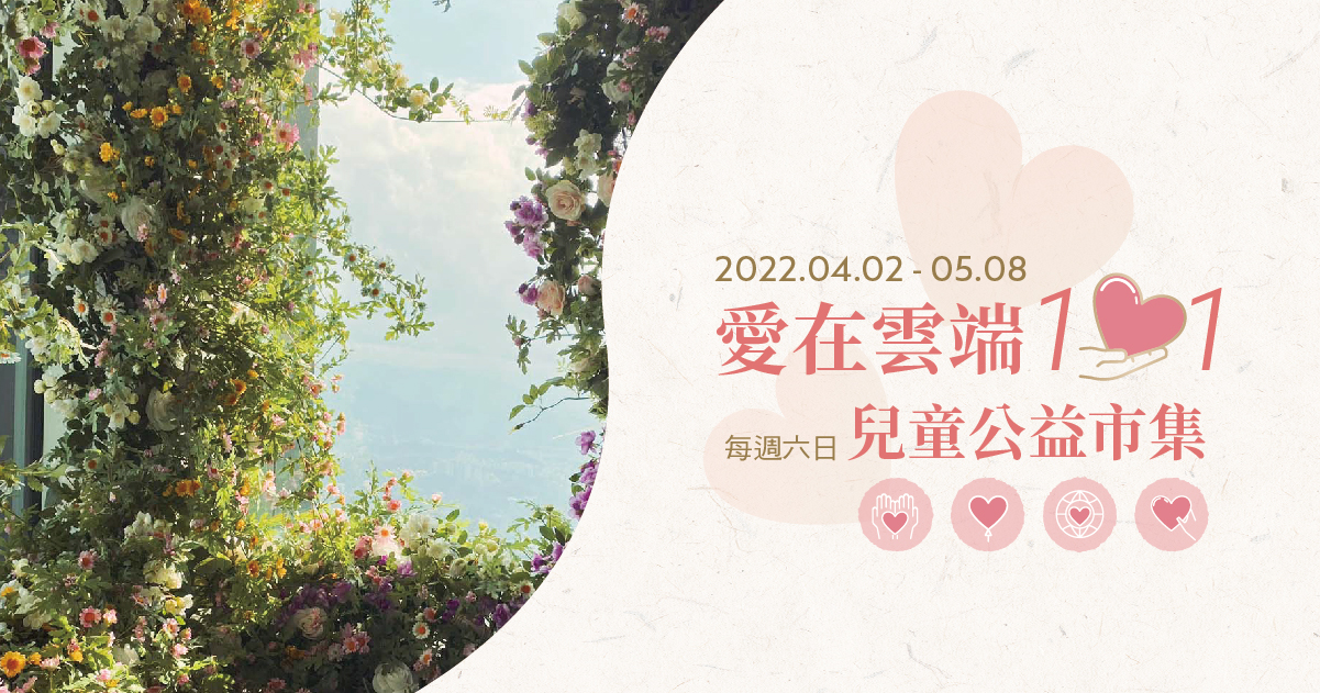 台北101將於2022兒童節連假起至母親節,於親子最愛造訪的台北101觀景台,結合台北市政府觀光傳播局以及台灣眾多具有影響力之公益夥伴,連續六個周末盛大舉辦「愛在雲端101兒童公益市集」公益性質活動,以實際行動為弱勢兒童之發展教育善盡一己之力,同時發揮影響力,串連企業與品牌,號召愛心,勉勵行善。