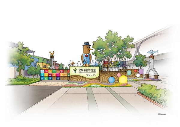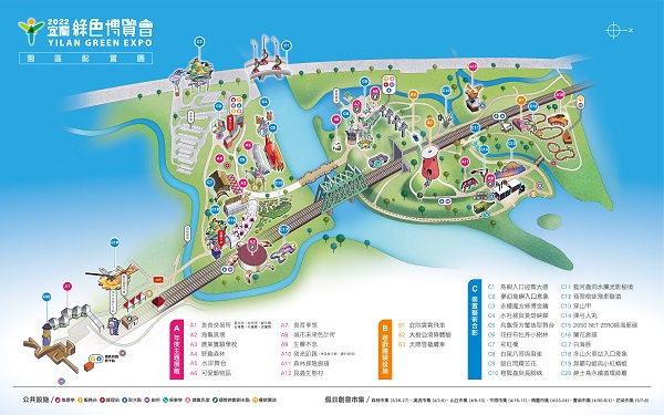 2022綠博初始設計「 1座烏龜怪方蟹大型表演舞台、1處藍河蟲洞水簾光影秘境、 2條冬山河道人文生態導覽遊程、 3個滑翔升降遊戲互動體驗區、 12個寓教於樂的綠博永續主題展館、 20座生物多樣性保育與多元文化藝術裝置」,並熱情邀請理念相同的夥伴縣市政府加入展售特色農漁特產,一起為環境永續而努力。