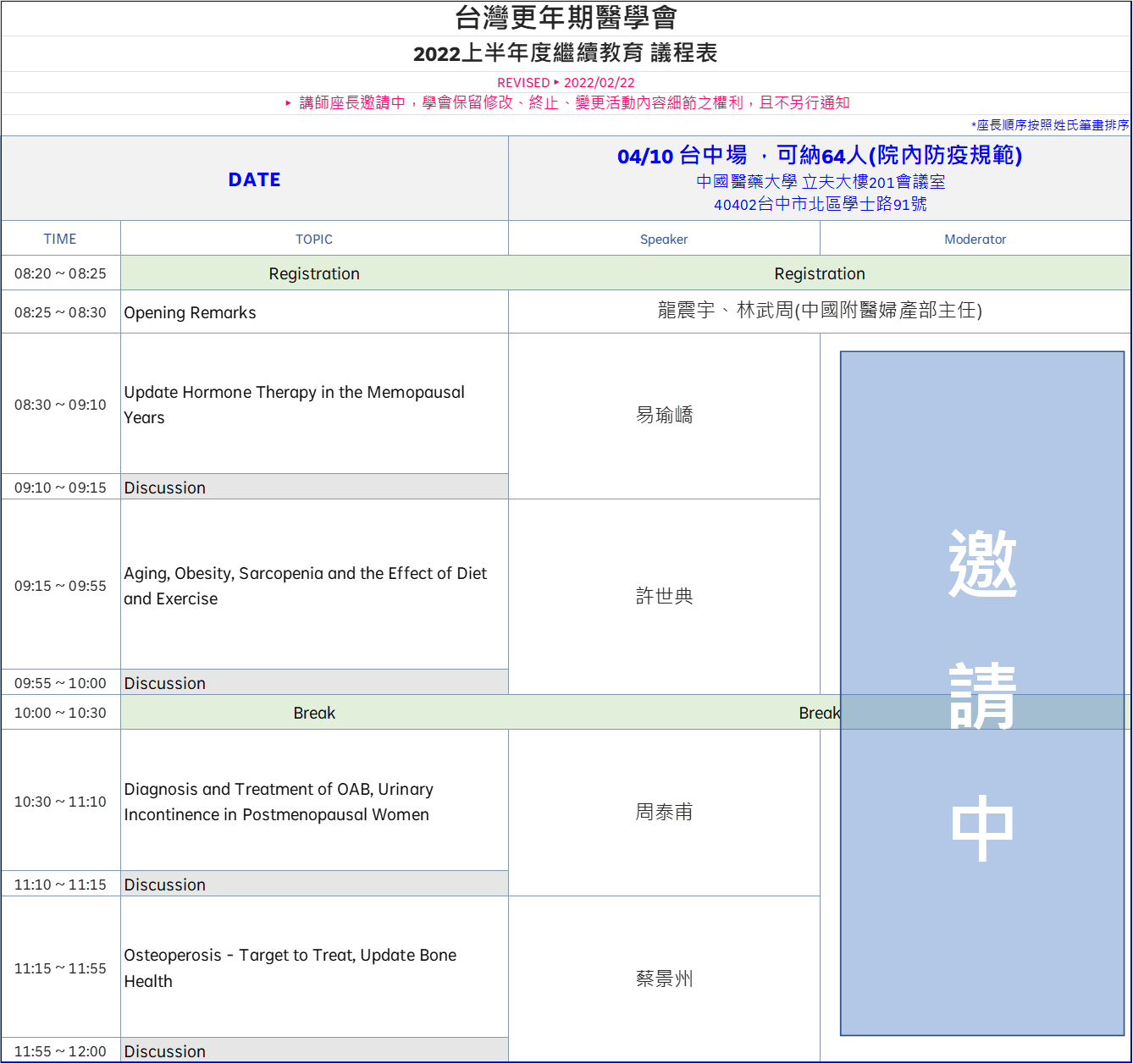 ★本活動將依照中央疫情指揮中心規範做滾動式調整,最新消息請見學會官網(http://www.menopause.org.tw/)。