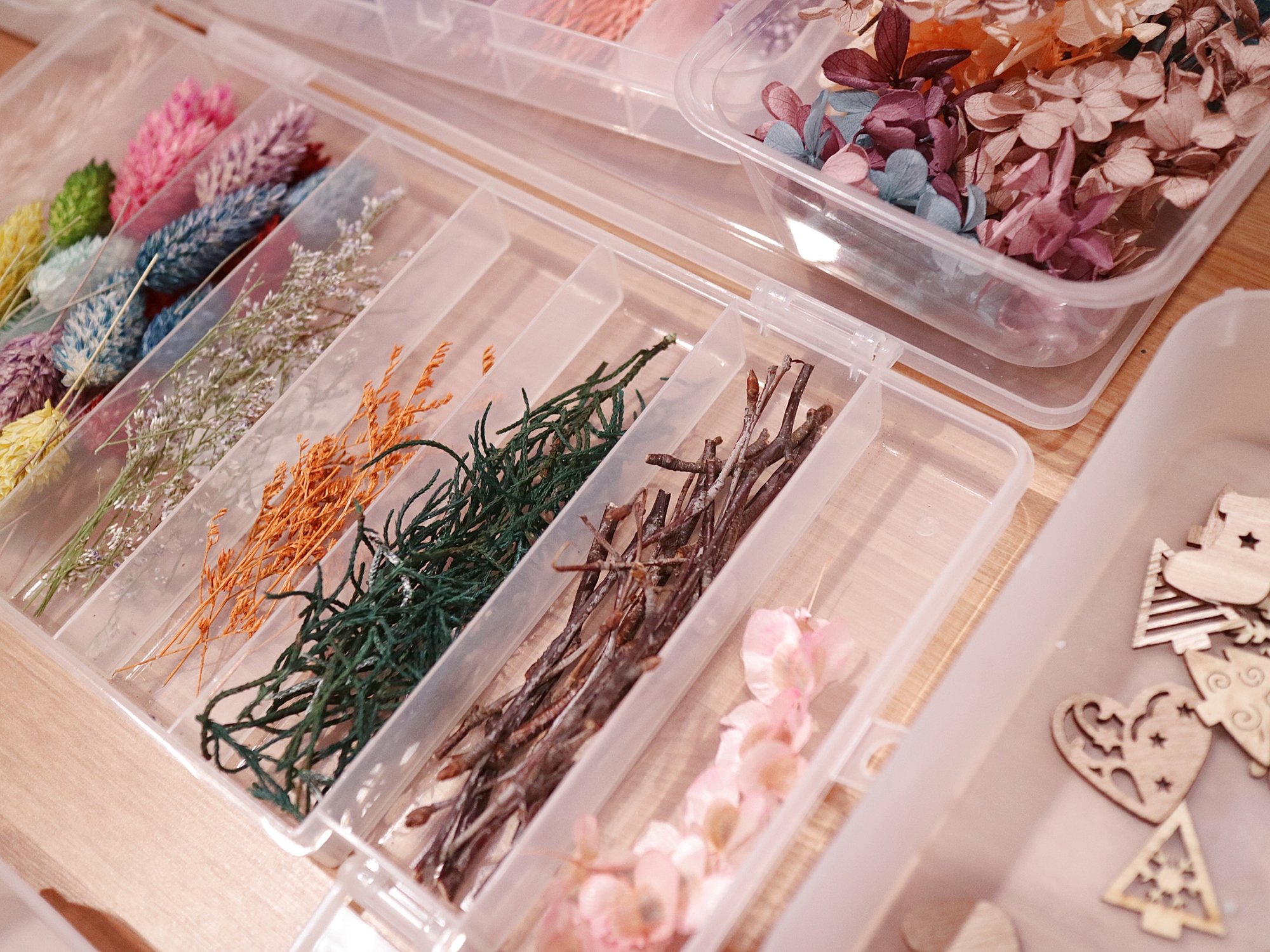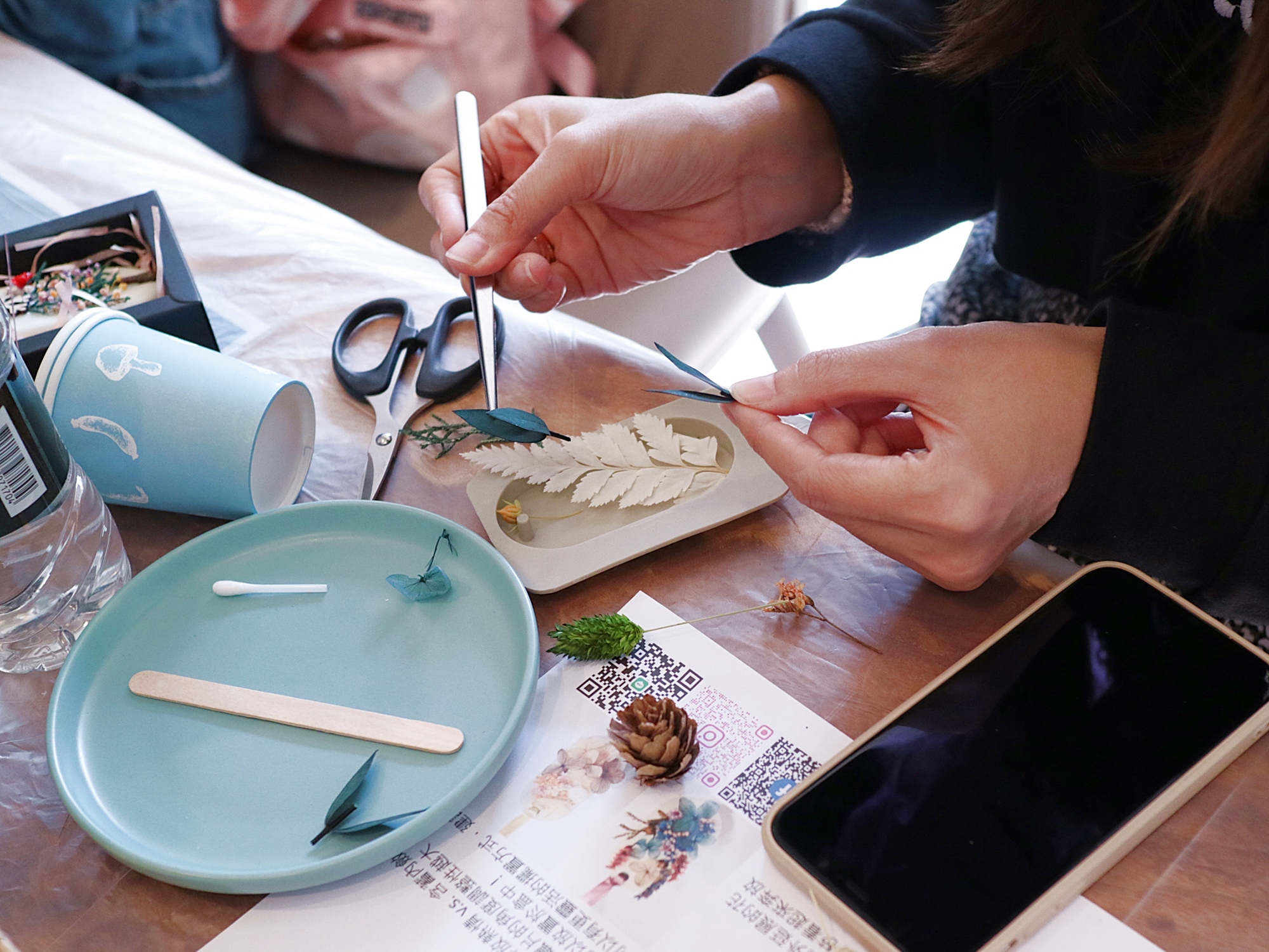 現場備有各式各樣進口永生花與香氛精油,