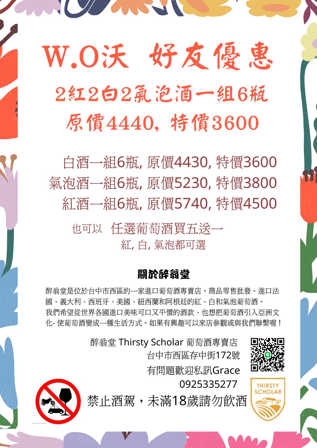 到「醉翁堂 Thirsty Scholar 葡萄酒專賣店」憑本場演出購票證明即享下列DM組合優惠!