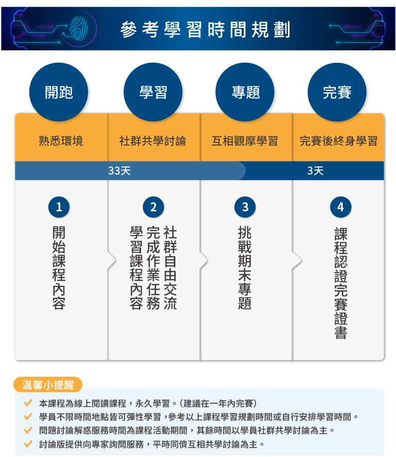 活動時間為參考時間,您可隨時依照個人時程安排學習進度,達成馬拉松完成條件與期末專題指定目標,將頒發完賽證書。(建議在一年內完成,效果較佳)