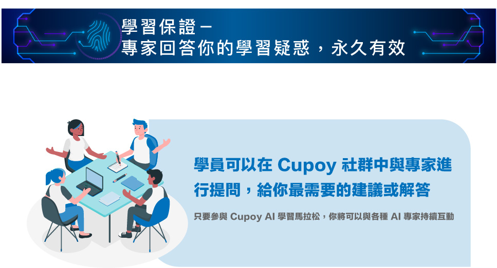 本活動的學員能永久使用 Cupoy 的 VIP 共學社群服務,隨時與專家群切磋討論 AI 問題,自由交流與觀摩其他學員作品與模型。