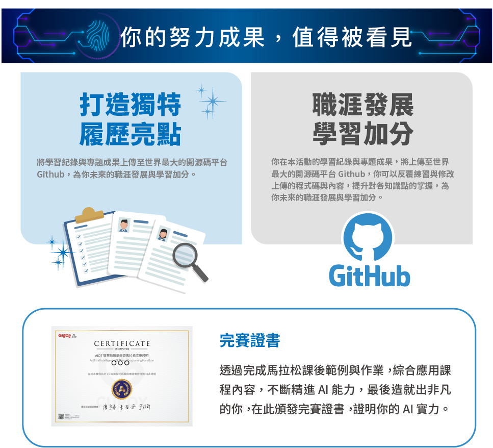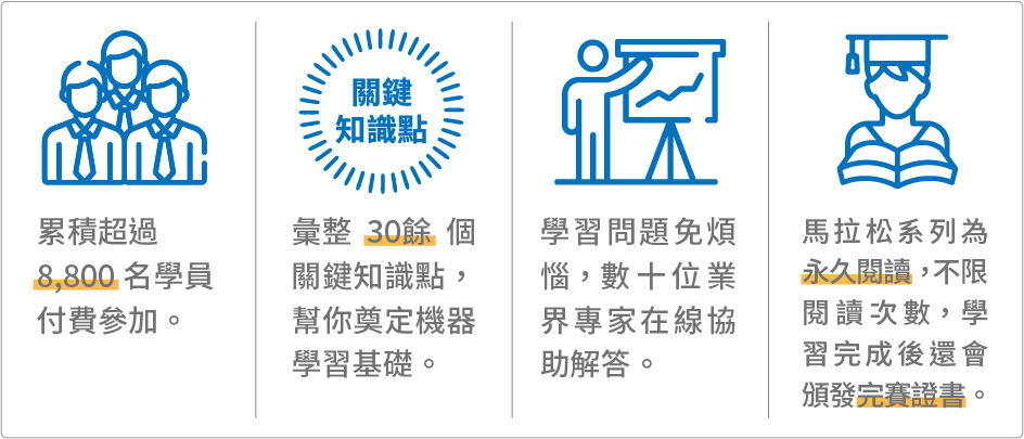 AI 學習馬拉松系列購買完成後,即可永久閱讀,不限閱讀次數,學習完成後還會頒發完賽證書。已累積共超過 8,800 多位學員參與,想要與專家與同好一起學習的朋友,這次要把握機會報名。本屆馬拉松除了有更多 AI 專家加入、原有教材再升級,提供更多延伸閱讀,幫你更有系統掌握 AI 知識。