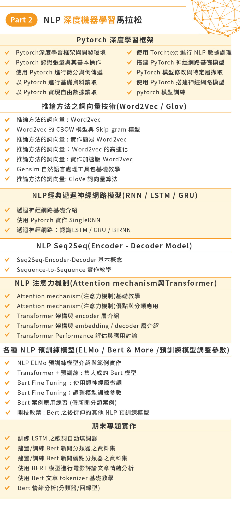 - Part 1 :著重於 NLP 的基礎知識與 NLP 經典機器學習的重要知識點 (課程介紹連結:)