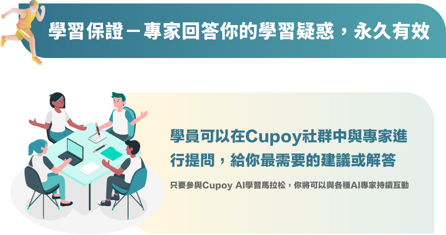 - 只要參與 Cupoy AI 學習馬拉松,你將可以與各種AI專家持續互動,永久有效