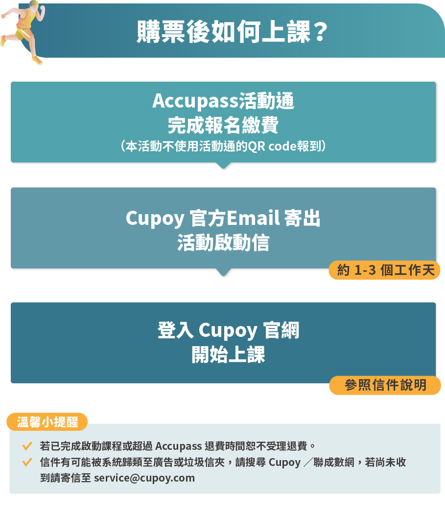 報名多人票券,僅有課程訂購人Email會收到由「Accupass」系統自動寄送訂單完成信,您與朋友將於課程上線時,收到由主辦單位分別寄送的課程活動通知信。