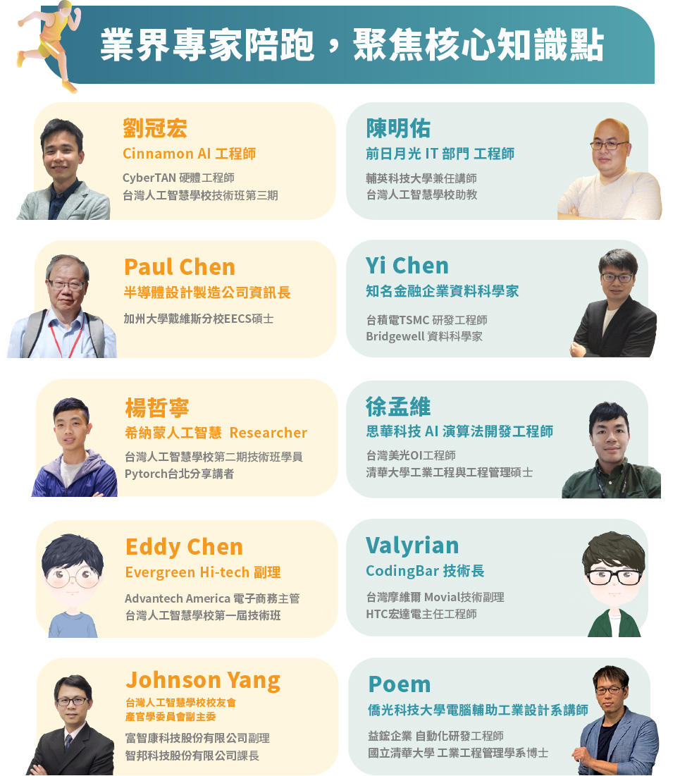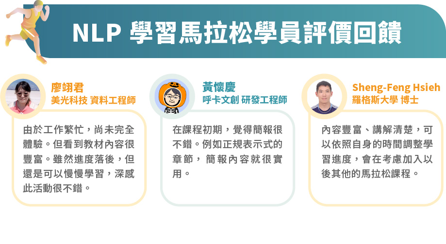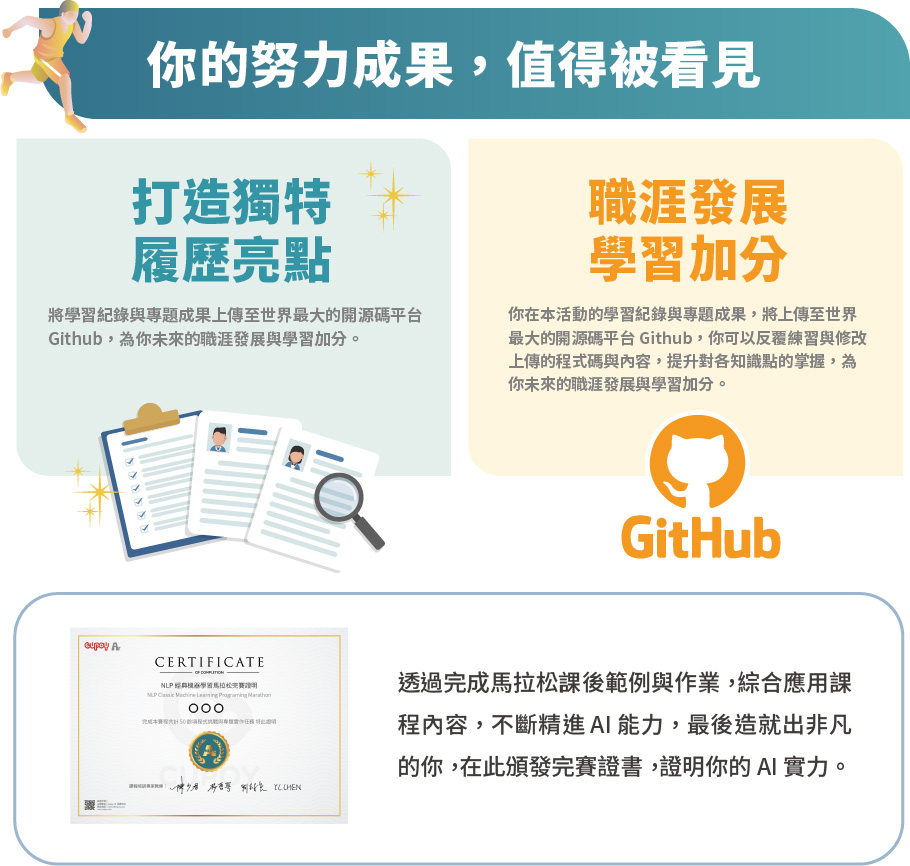 本活動匯集了大量台灣優秀的AI專家與專業的軟體工程師,彼此分享與優化學習過程後,規劃本課程的最佳學習地圖,幫助 AI+NLP 學習者能夠以更有效率的方法學習。加入專家們的學習社群,你能更快掌握產業應用的關鍵知識。此外,透過程式實戰檢驗學習成效,留下你的實戰紀錄,讓其它人看見你的能力與努力。