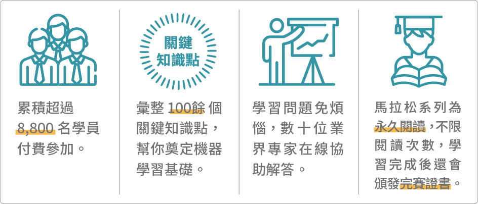 AI 學習馬拉松系列購買完成後,即可永久閱讀,不限閱讀次數,學習完成後還會頒發完賽證書。已累積共超過 8,800 多位學員參與,想要與專家與同好一起學習的朋友,這次要把握機會報名。本屆馬拉松除了有更多 AI 專家加入、原有教材再升級,提供更多延伸閱讀,幫你更有系統掌握 AI 知識。