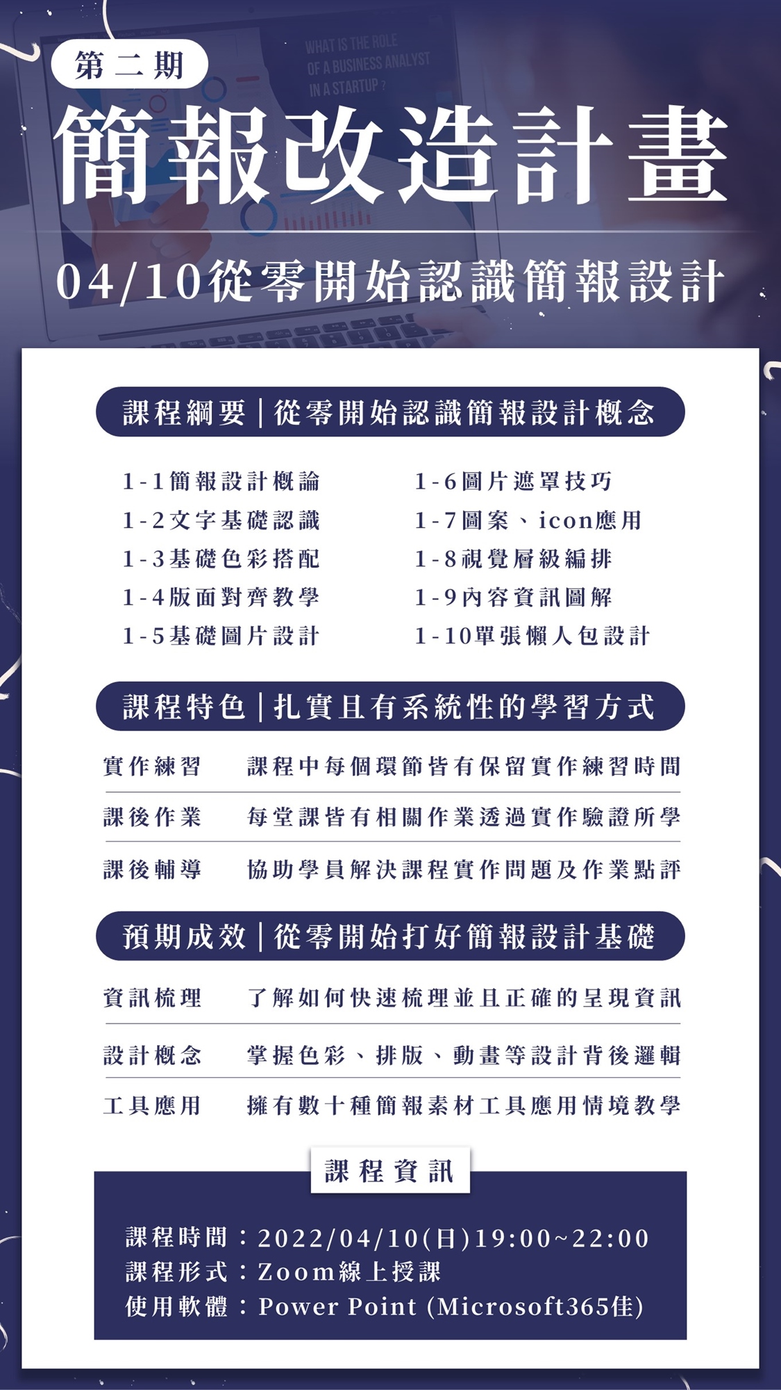 受簡報困擾的朋友,不用擔心!【從零開始認識簡報設計】開課啦~在課程中將會透過課程學習、課後實作、實作優化的系統性學習方式,讓學員能夠扎實學習。