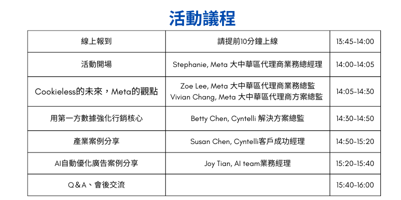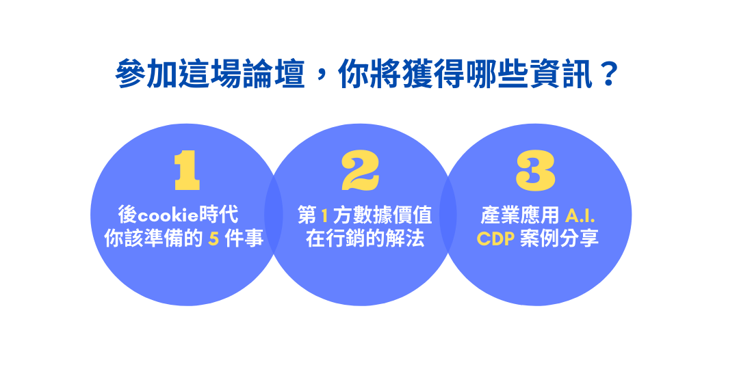 本次邀請Meta台灣臉書行銷團隊一起跟我們分享,在全新數據環境下,如何使用第一方數據持續創造臉書廣告成效。 搭配實際CDP與第一方數據應用案例,企業如何鞏固市場競爭力。