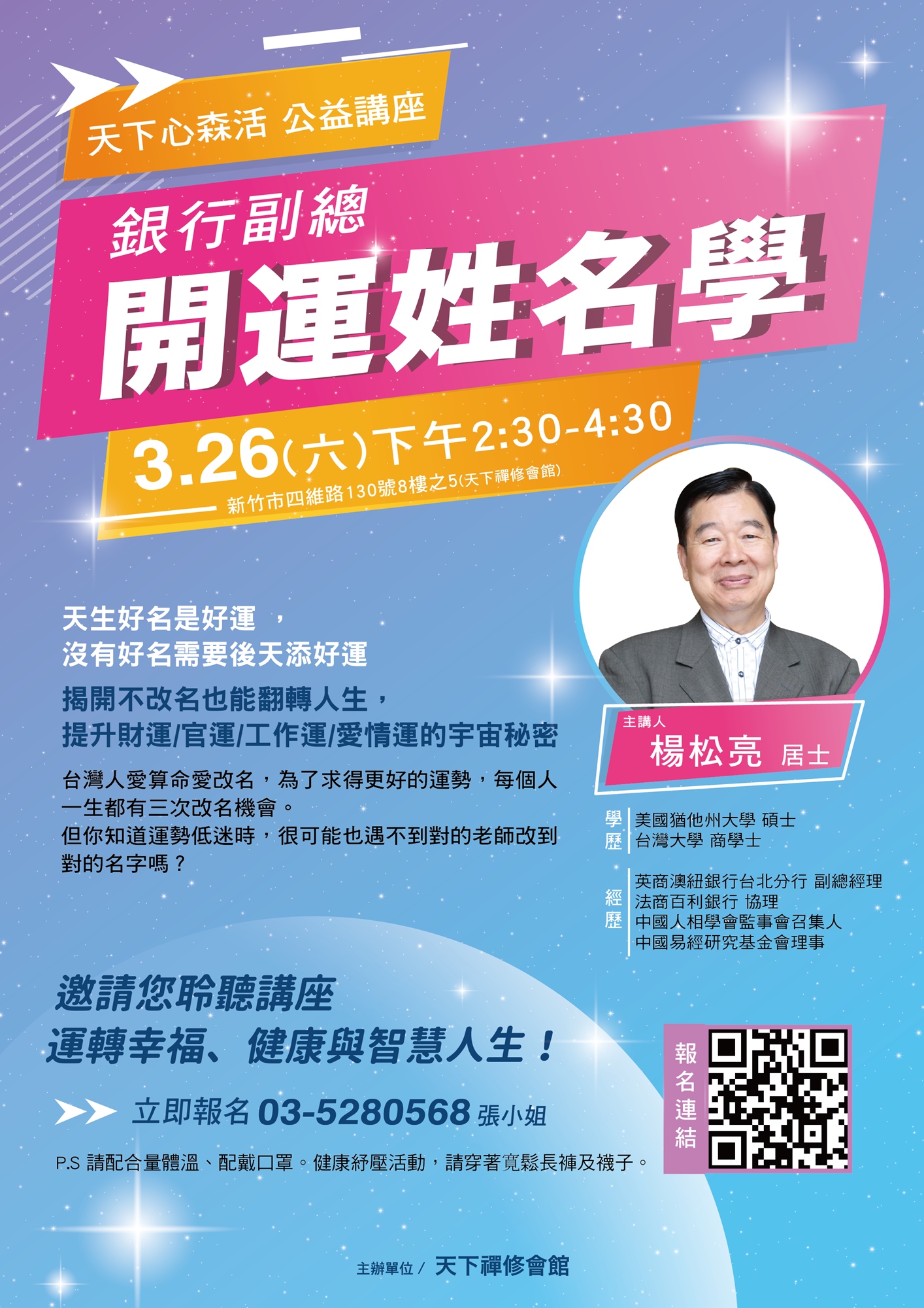 💎天下心森活公益講座💎【銀行副總 開運姓名學】