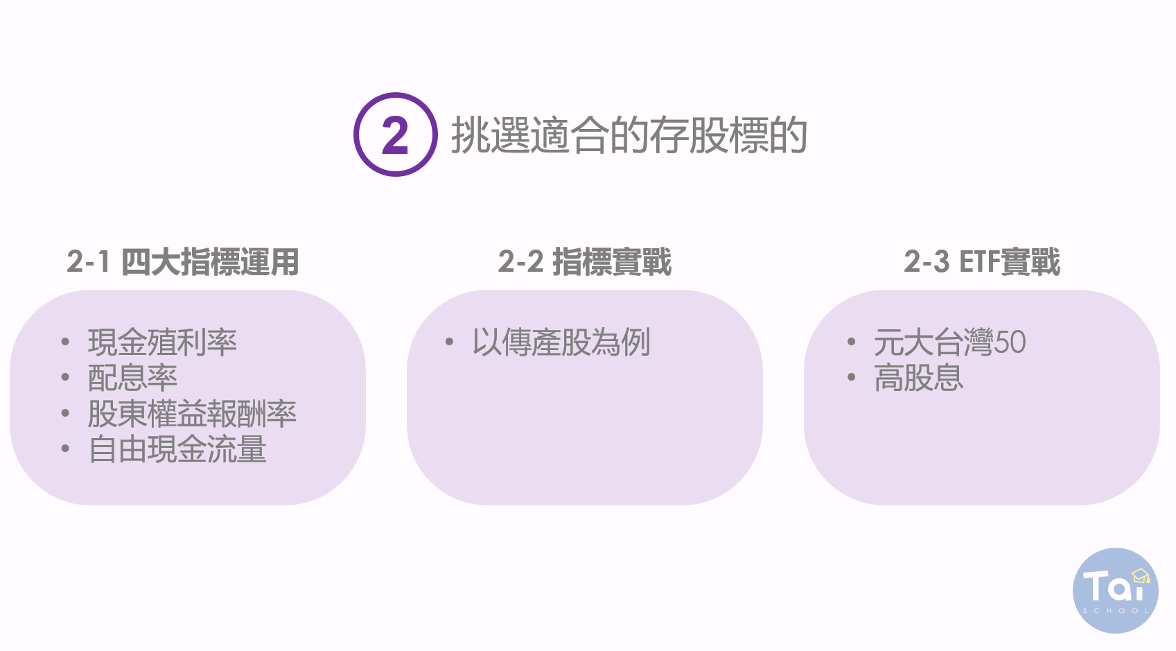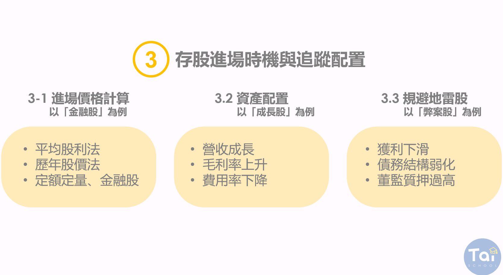 這堂課教你用財務指標挑出好體質適合存股的標的、判斷良好的進場時機、並能學會依據需求而配置不同類型的資產標的,此外建立關注表與原則淘汰跟選擇,最終幫你達成財富自由的退休生活。