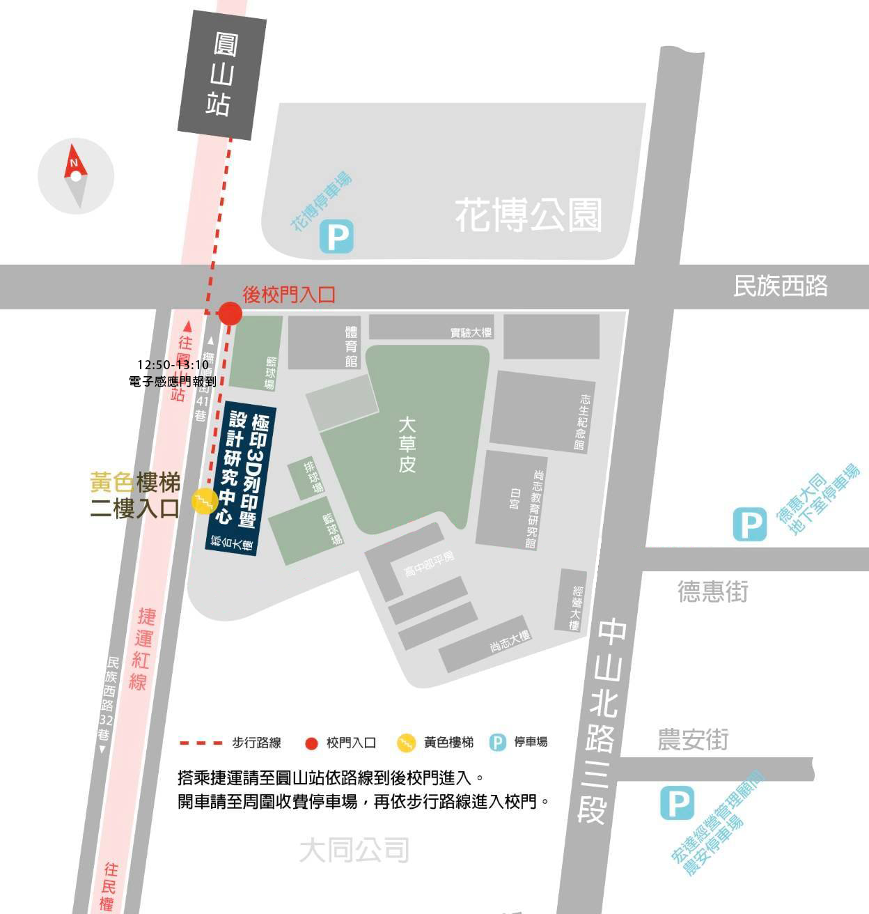●活動地點:極印3D列印暨設計研究中心-台北市中山區中山北路三段40號(綜合大樓2樓)(大同大學內)如下圖,請於下圖中後門"電子感應門"處集合,貼心的極印3D夥伴當天12:50-13:10會於後門帶大家進來,這樣子比較好找唷~