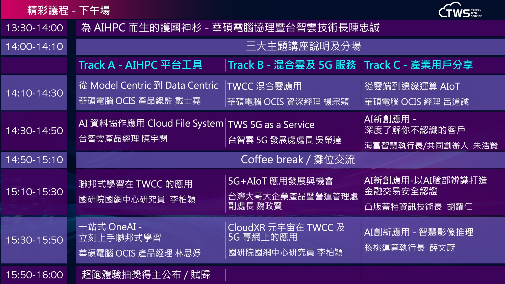 - 三大主題講座自由參與:以 AI 超級電腦的 AIHPC 高速運算核心技術出發,下午場特別劃分「AIHPC 平台工具、混合雲及 5G 服務、產業用戶分享」專場,從技術領域到商機應用,您可任意挑選有興趣的主題參與。