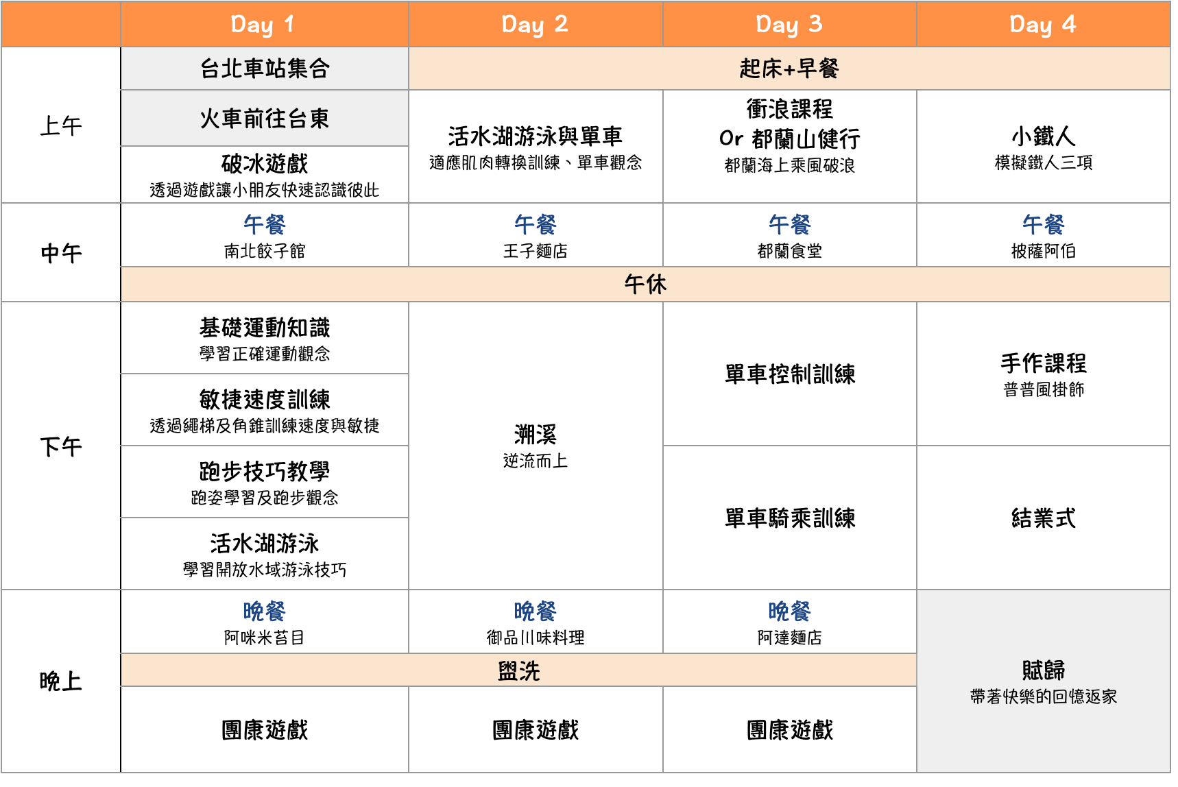 活動宗旨:堅持、勇敢、突破是鐵人三項運動的精髓,由一群熱愛戶外運動的鐵人三項教練帶領小朋友們學習鐵人三項的技巧與體驗完成它的美妙之處。在這營隊可以學習到溝通、團隊合作、鍛鍊體力、學習運動觀念及技巧,結合台東特色活動,讓小朋友們不只鍛鍊到體力、毅力,也能親近大自然,接受大自然的洗禮。