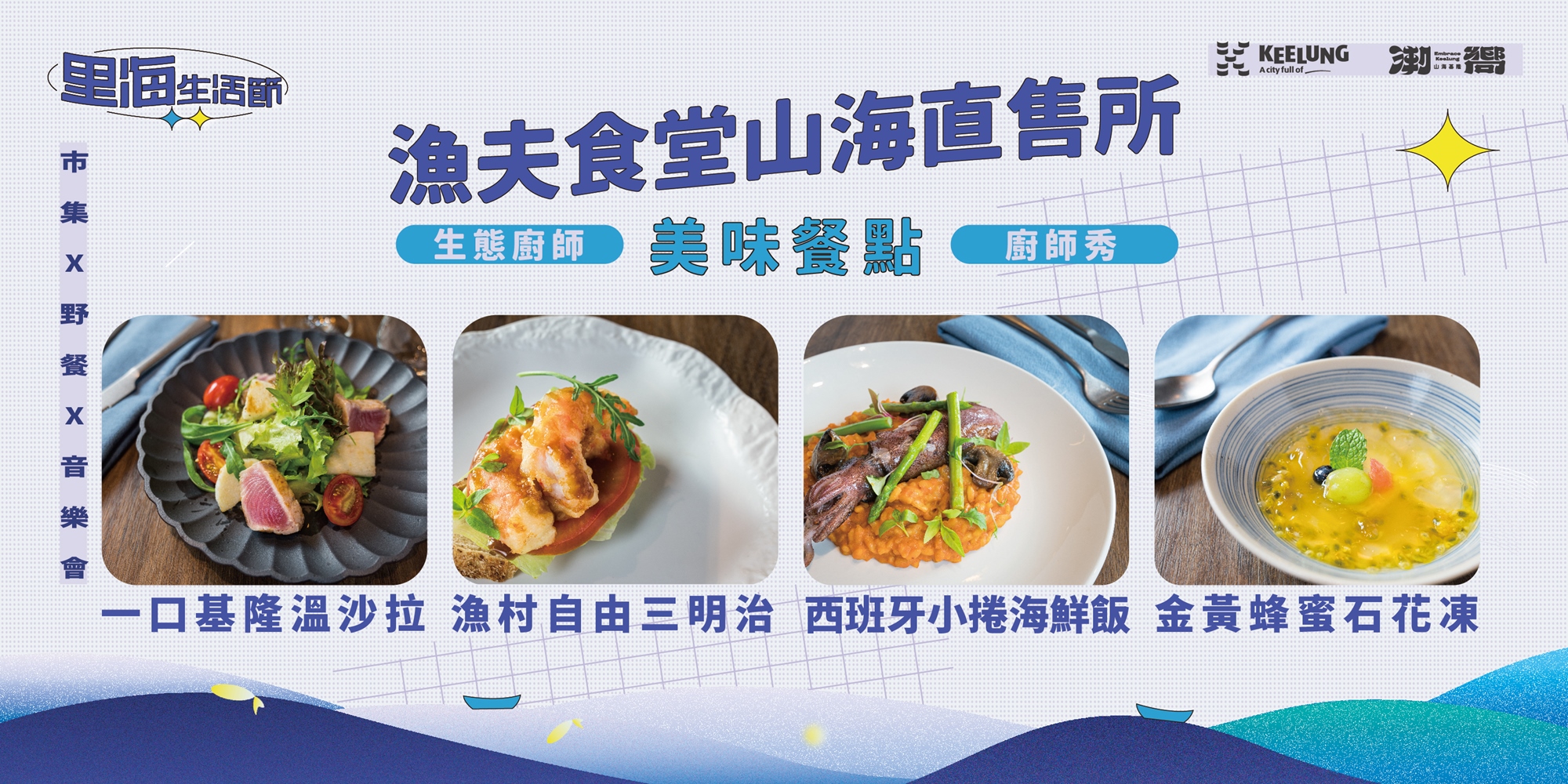 「潮嚮買」&「潮嚮吃」活動推出基隆限定在地餐點吸引前來參加活動的遊客,由生態廚師精心設計美食菜單,細心打造基隆好味。現場料理直售所產品,以當季食材為軸心,搭配多元的料理手法,將食材的新鮮以不同形式呈現,料理台前就像欣賞了一場美味的視覺饗宴。遺址廣場古蹟下用餐,拍照打卡來場風饗宴。 城博期間限定造型餐車,販售基隆當季最新鮮魚貨,不定時在城博期間各場域驚喜快閃!品嘗餐點後歡迎將食材帶回家!