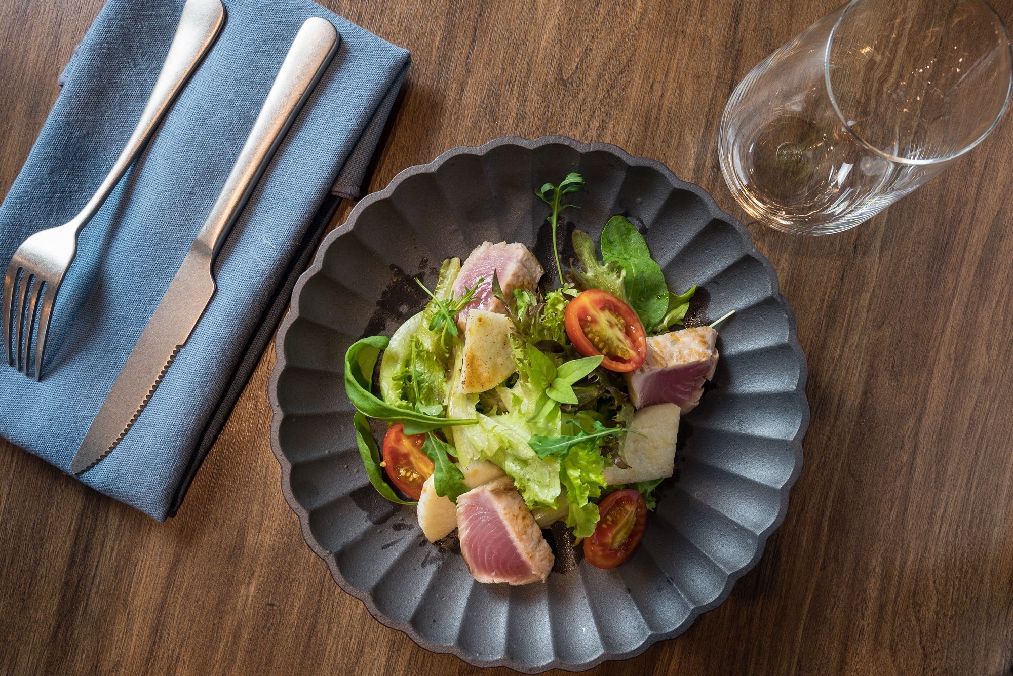 時令海魚搭配豆腐基隆醬油食令蔬菜的溫沙拉