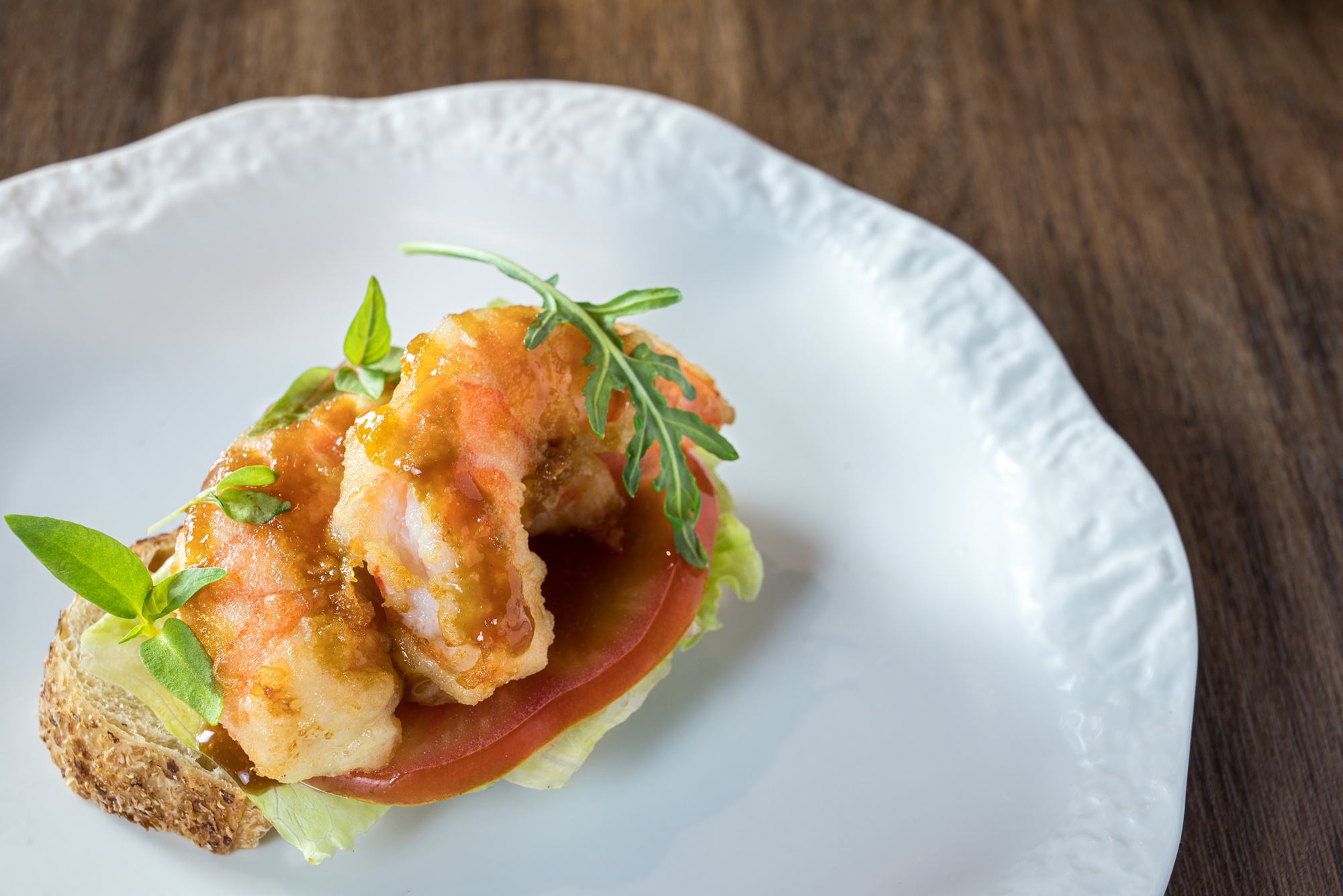 主餐 | 2.漁村自由三明治 本港蝦類、各式小海鮮,酥炸後加加入基隆蜂蜜做的照燒醬,加上食令蔬菜,漁夫的豪邁一覽無遺,一口山一口海 |