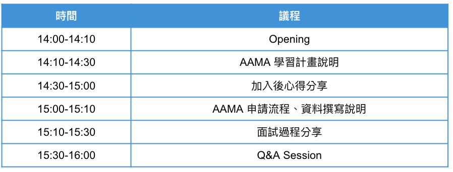 - 瞭解AAMA設計長達兩年的學習計畫,如何進行以及其獨特性,如主題式工作坊、小組行動學習、導師一對一及多對一,各自為個人及公司帶來什麼成長?