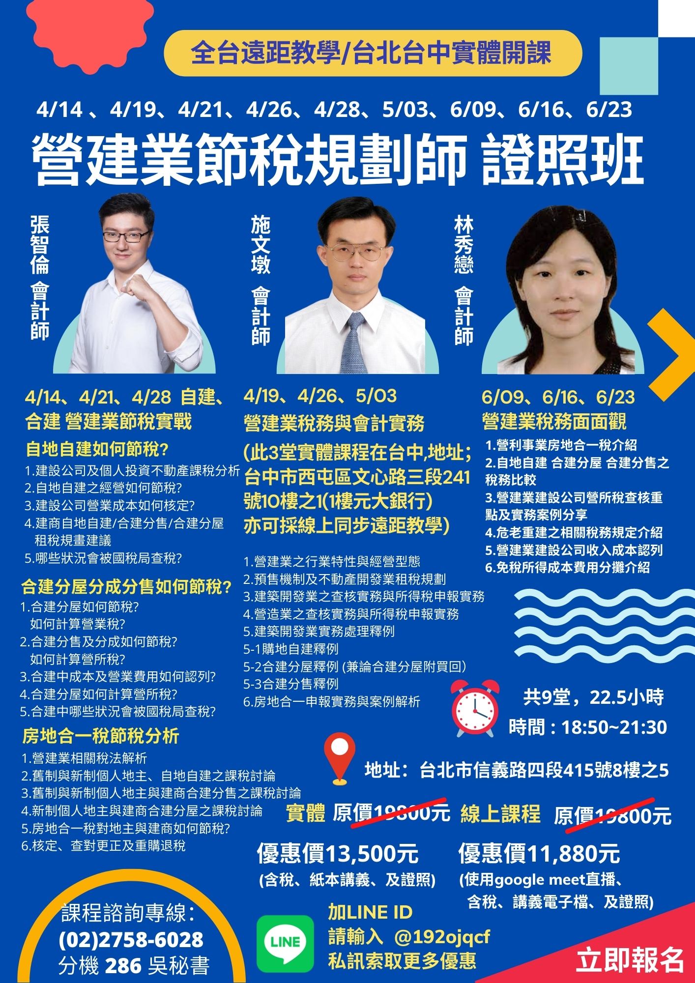 【全台遠距教學/台北台中實體開課】4/14起 營建業節稅規劃師證照班,新朋友首次體驗 800元/堂
