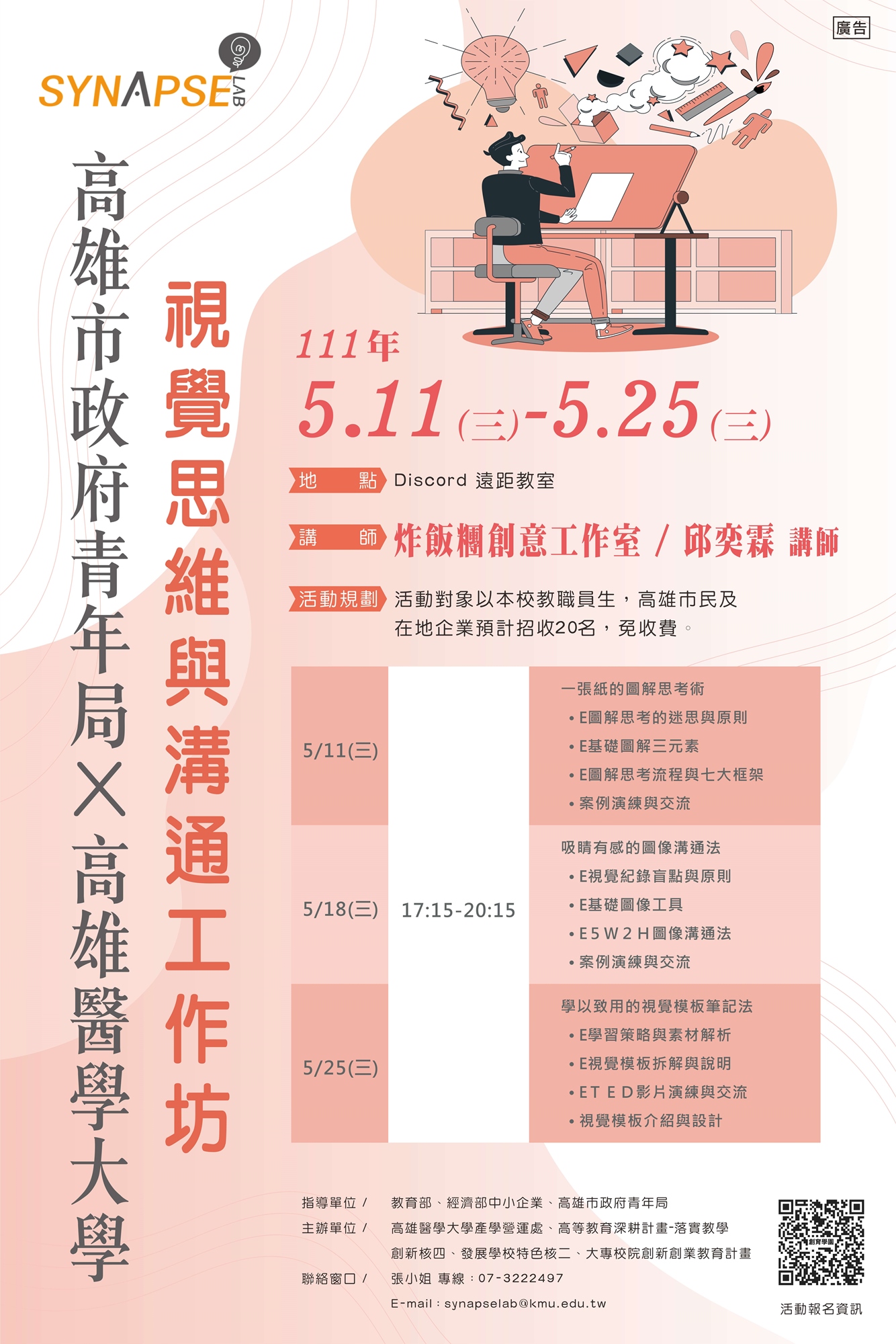 為擴大三創成效、引進外部資源,結合教育部及高雄市政府青年局等單位之補助,共同合作辦理『視覺思維與溝通工作坊』,本次課程結合視覺思維,聚焦在「圖解思考資訊整理」、「視覺紀錄有感溝通」、「視覺模板學以致用筆記」三大主題,以線上課程模式帶領參與者學習觀點、技巧、演練與共創。並讓學員學習了解視覺圖像基礎入門及如何運作,以運用在自身領域,並培育不同領域之專業與創新創業能力。