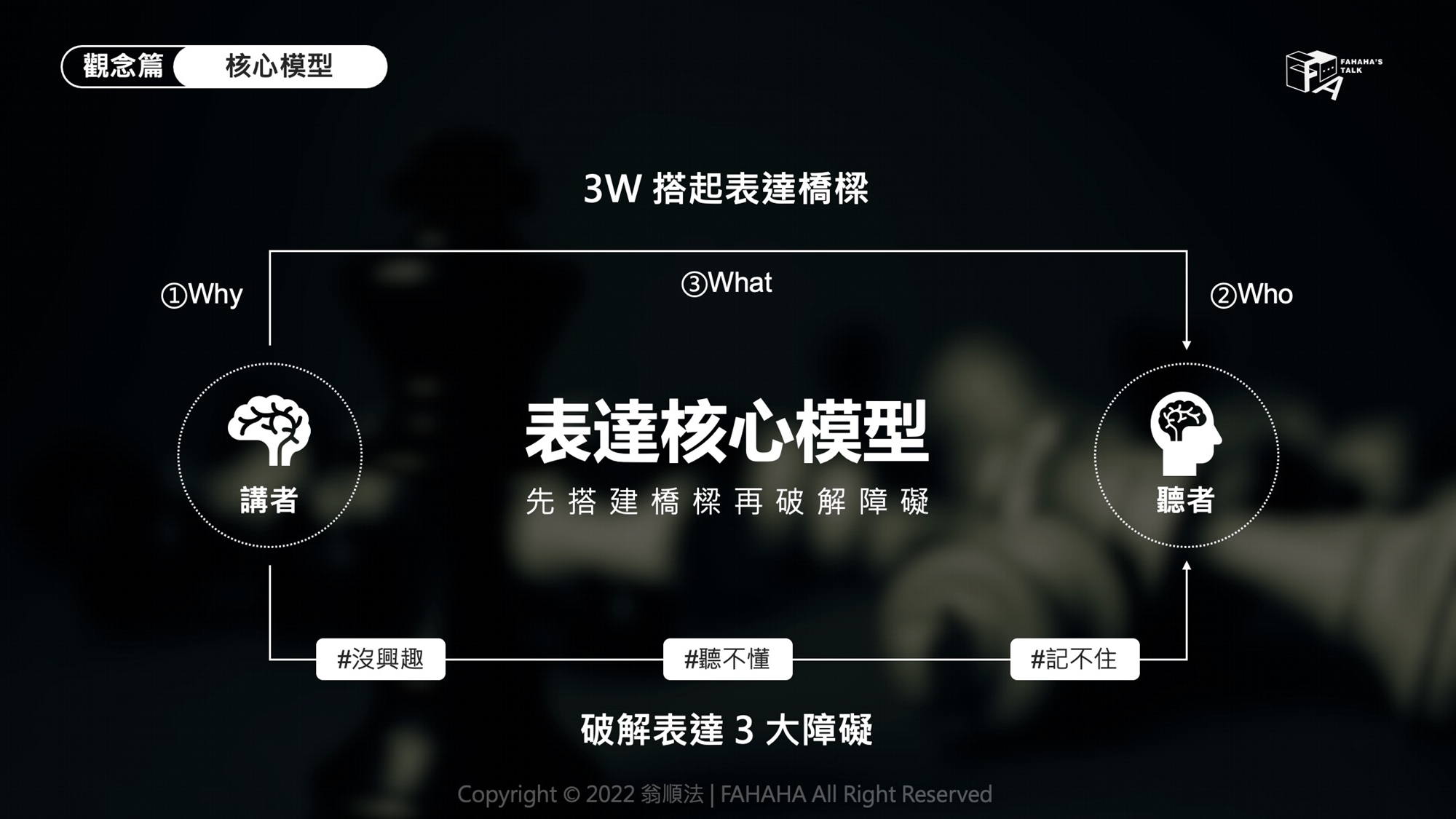 本堂課會從表達的核心模型出發,引出決定表達策略的兩階段六步驟,教你如何搭起表達的橋樑,並且逐一破解三個表達障礙。