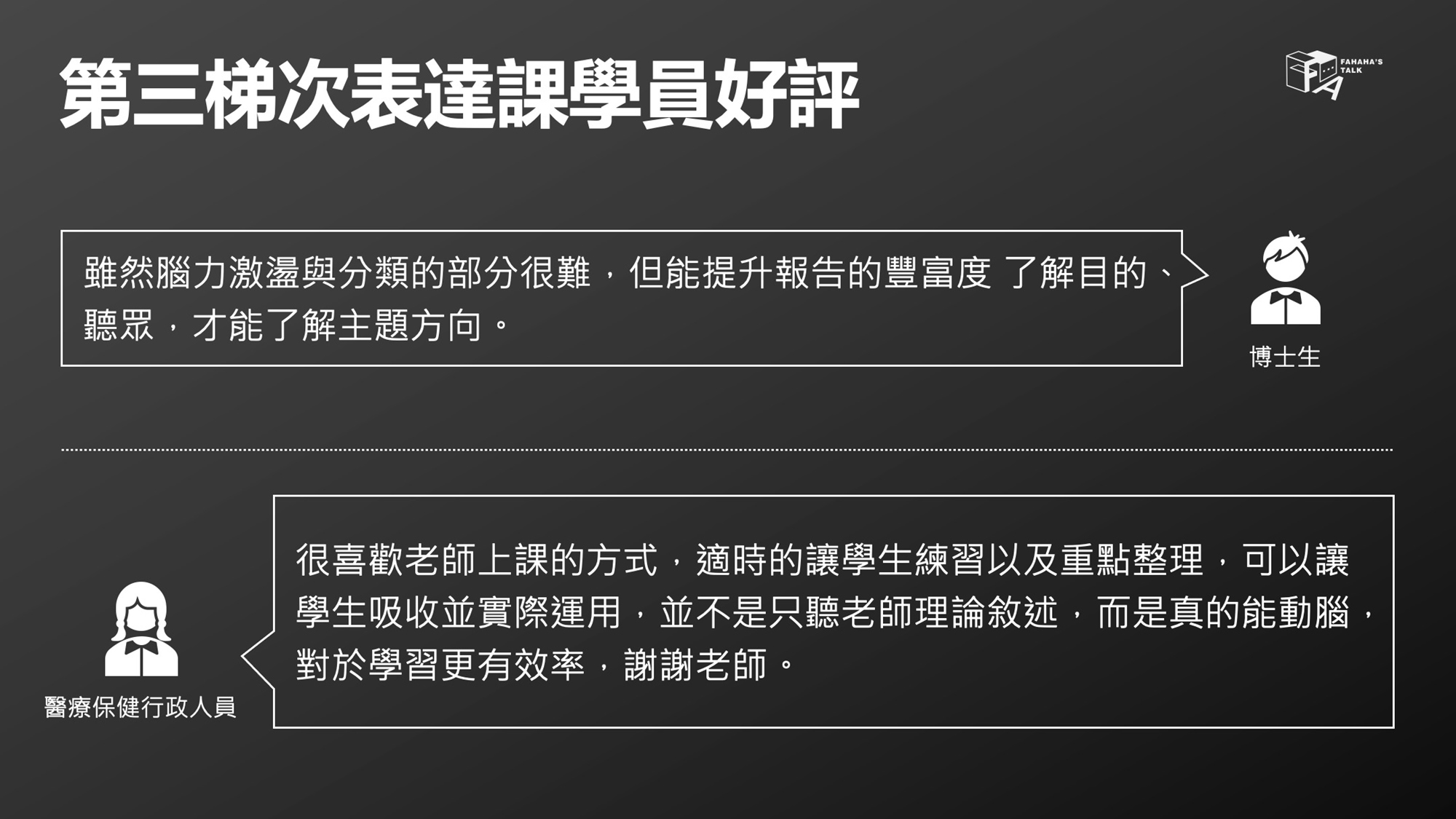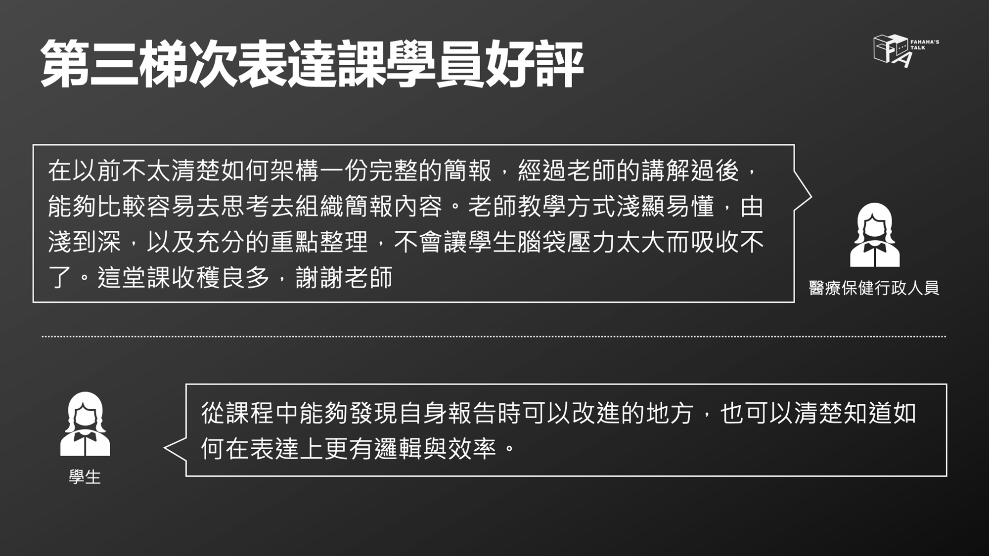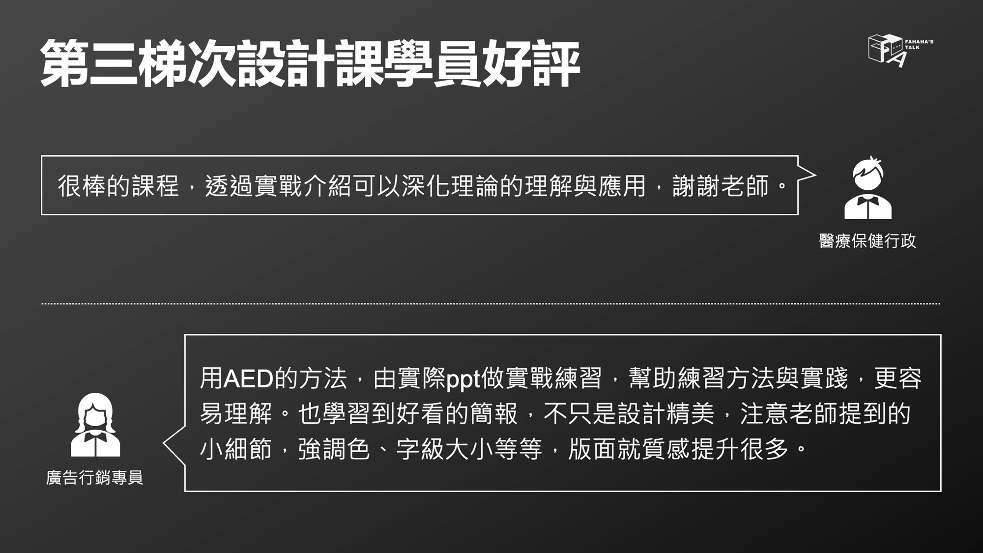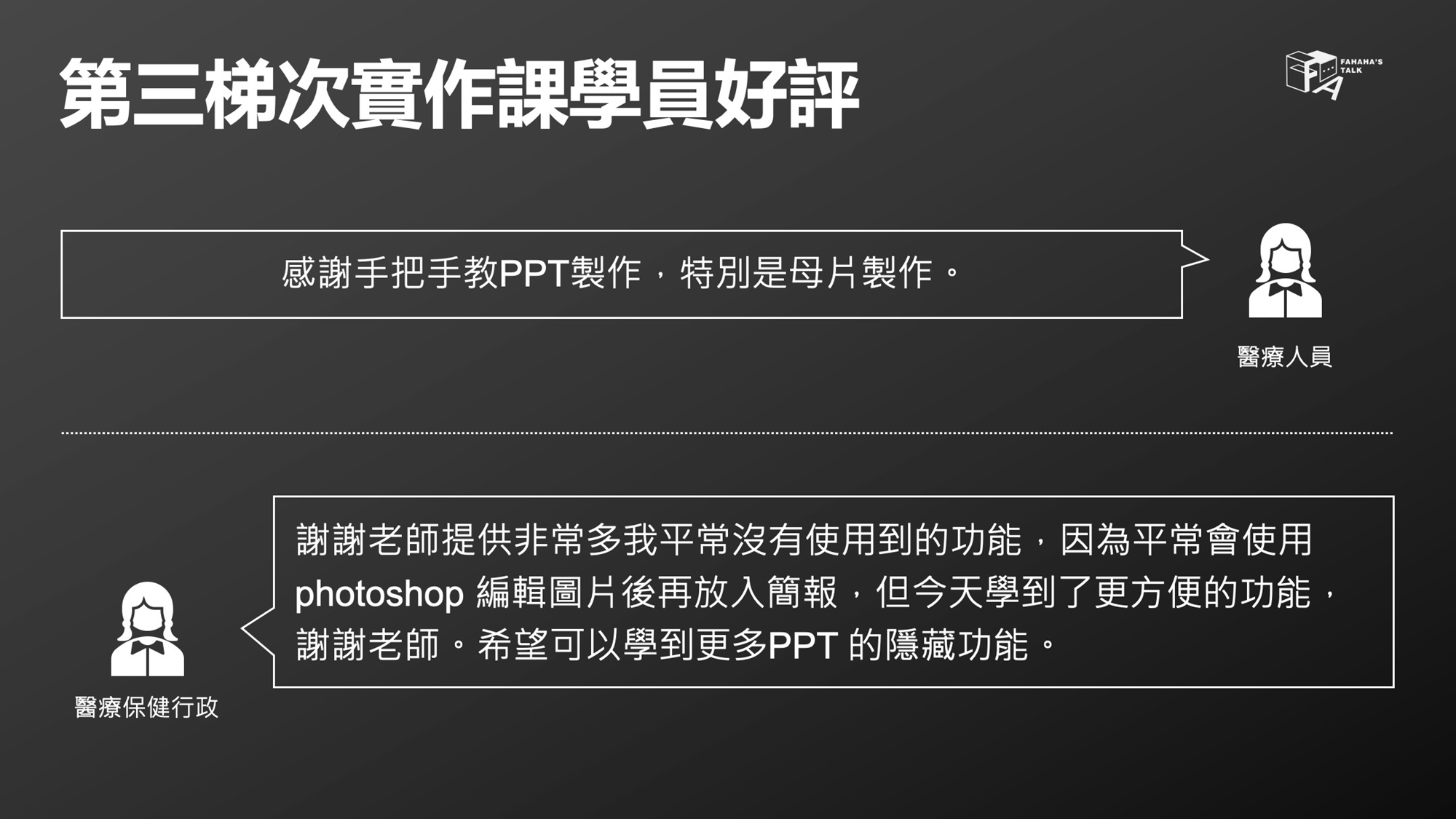 講者翁順法(FAHAHA)過去是護理背景,曾在南部醫學中心工作,大學時期就非常熱愛簡報與表達,甚至在學校創立了社團,每學期都固定舉辦課程與同學分享簡報設計與上台表達的觀念技巧。
