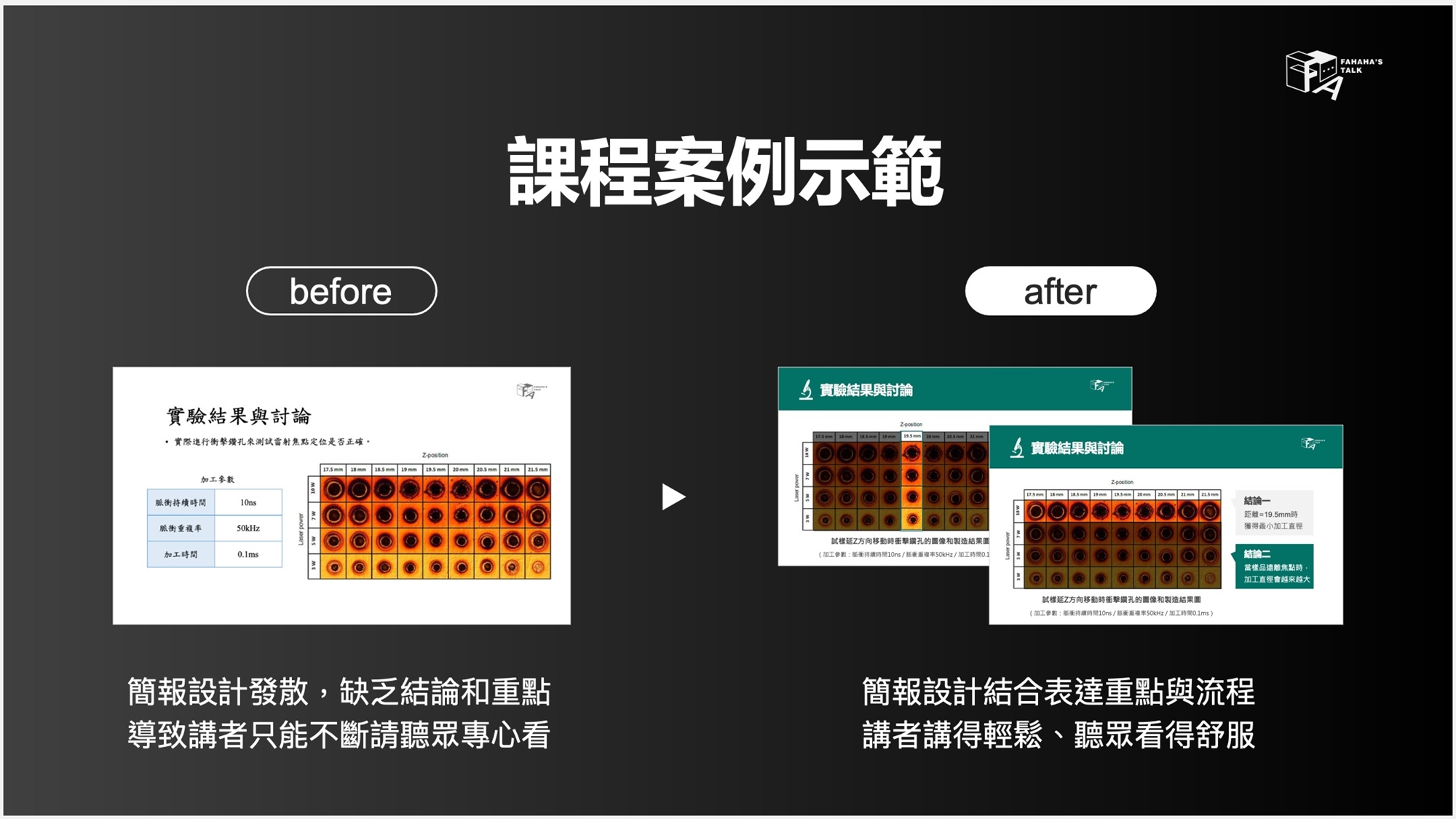 下次遇到簡報設計的問題時,你會知道如何思考與改善,讓自己表達更輕鬆、有邏輯,也讓聽眾能夠更快速的掌握重點。