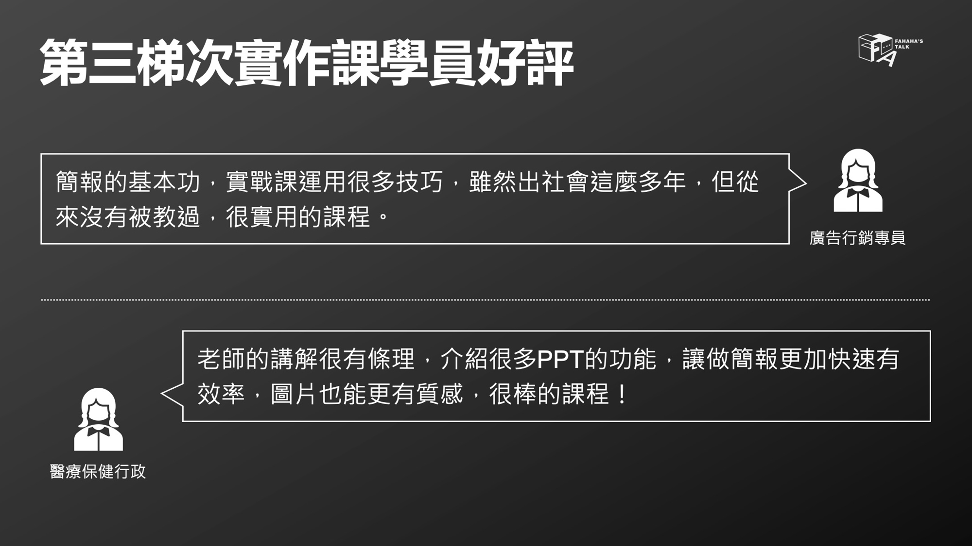 (小提醒:但若你對於PPT操作「超級不熟悉」,如:不會插入圖片、不會更改文字顏色等,建議採一對一的學習方式,效果會更佳)