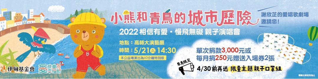 費用:以捐款贈票方式,單筆捐款1,500元即贈親子演唱會入場券乙張;4月30日前還有早鳥活動,單筆捐款3,000元即贈入場券2張,更加碼贈送限量主題親子口罩組(大人口罩50入+兒童口罩50入)乙組,限量100組(隨機出貨不挑款)。