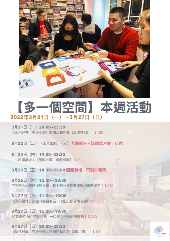 「多一個空間」由【多多看電影】的部落客-多多 所創立,一個致力於舉辦各種娛樂活動的場地,是一家複合式桌遊咖啡店,座落於龍山寺捷運站3號出口,視覺裝潢以馬卡龍粉與湖水藍為主要色調,與附近巷弄的古宅呈現極大的跳躍反差。