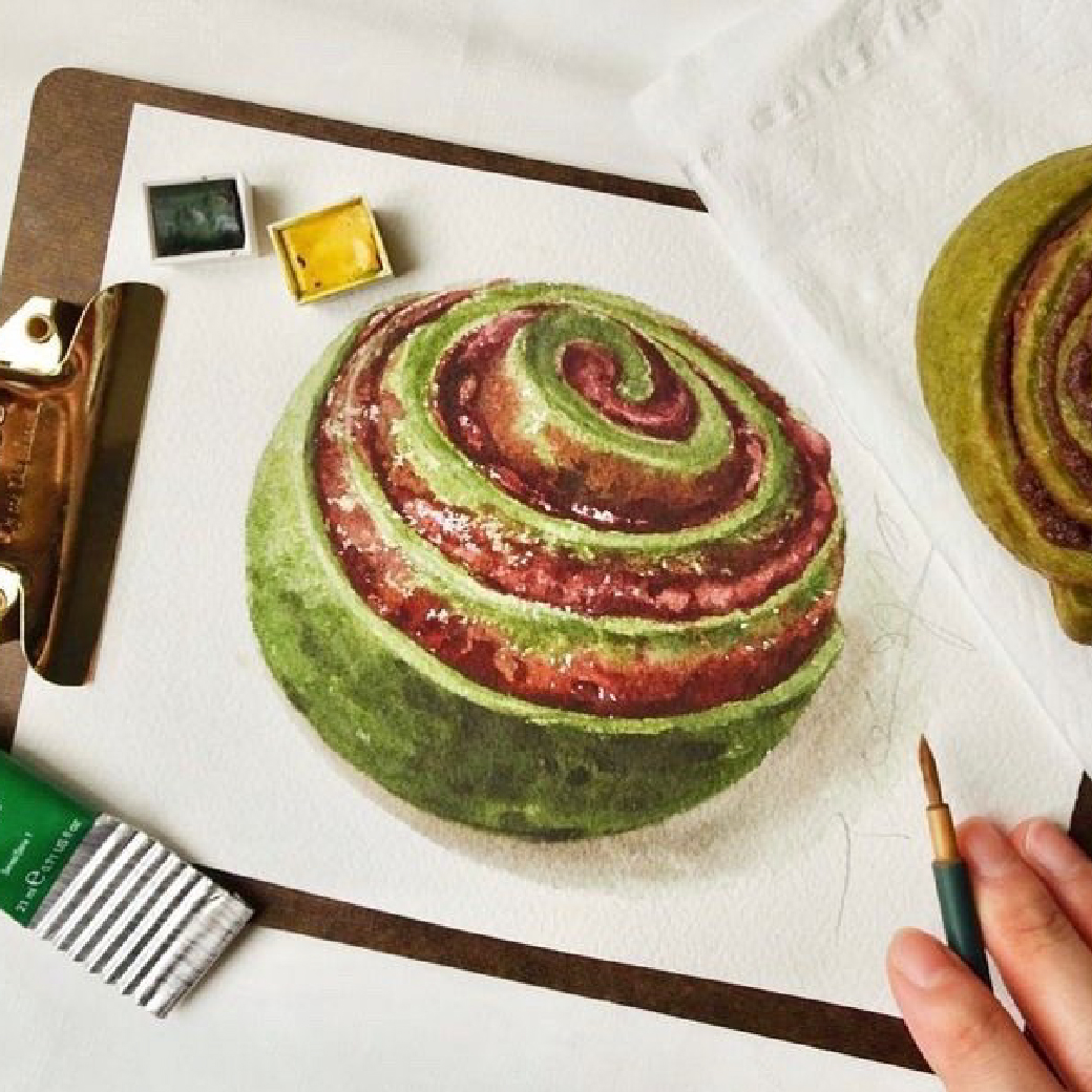 濃厚抹茶的調色細節與顏色運用,濃淡深淺的變化做出細膩的紋理,使畫面構圖簡單生動精彩!