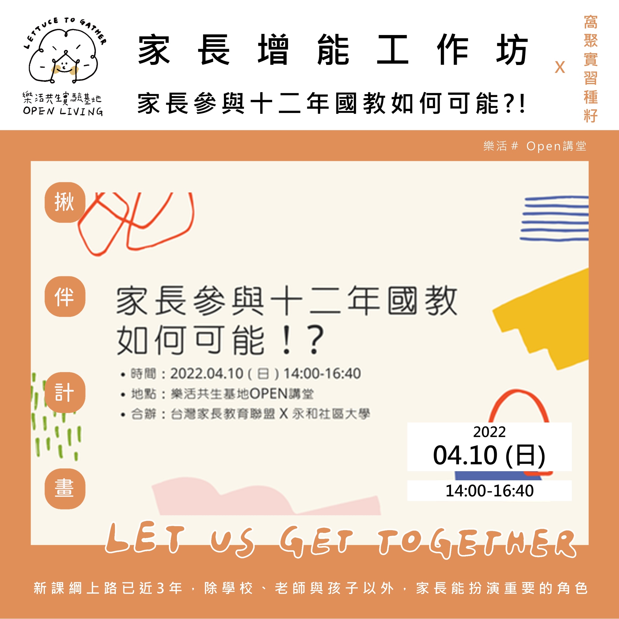 樂活基地四月免費活動 x |家長增能工作坊:家長參與十二年國教如何可能?!| <揪伴2.0計畫 系列活動