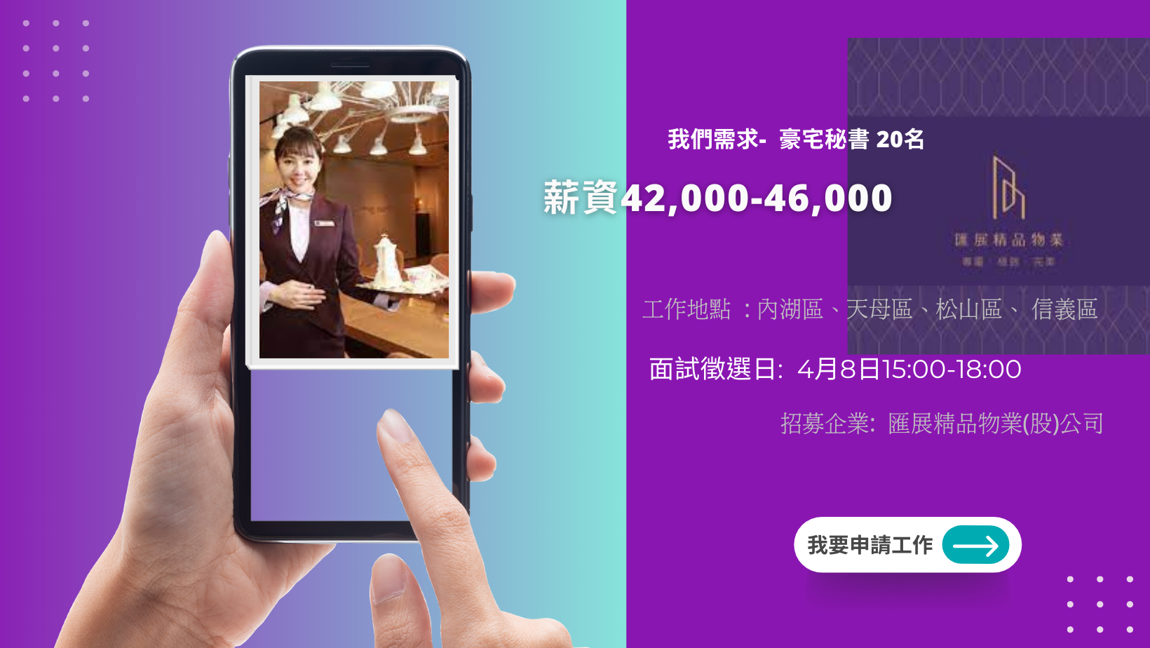 4月15日招聘會-徵求「豪宅秘書」薪資42,000-46,000, 你嚮往在豪宅工作 讓你的生活視野提升?