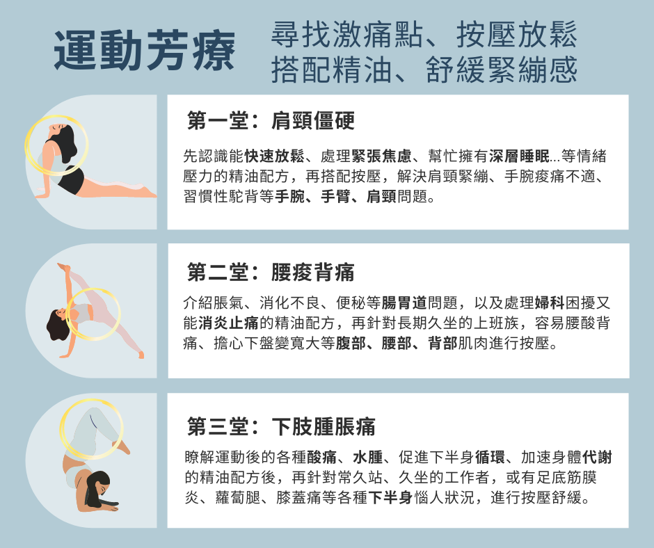 💪 針對久坐的上班族,容易腰酸背痛、下盤變寬大等腹部、腰部、骨盆問題,陪著你找到關鍵肌肉,並搭配對應精油按壓,找回放鬆舒適的身體。