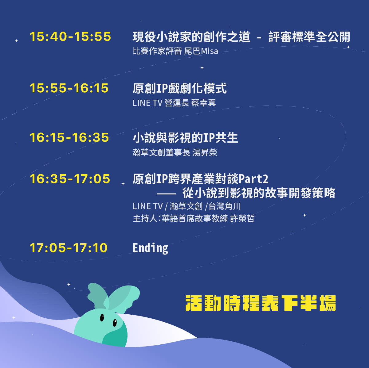 本活動分為上下半場,中場休息10分鐘。創作者可於直播開始前預先填寫問題表單,以利與影視/遊戲/漫畫等面向合作夥伴進行線上交流。