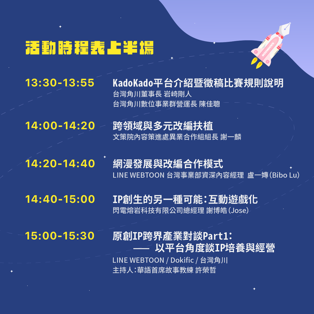 本次活動由台灣角川主辦,內容包含「KadoKado百萬小說大賞」競賽發表及說明,並請「文化內容策進院、LINE WEBTOON、LINE TV、Dokific、瀚草文創、知名小說家尾巴Misa、首席故事教練許榮哲」等產業合作夥伴,透過座談會分享創作歷程、產業觀點及作品IP化條件等業界秘辛。