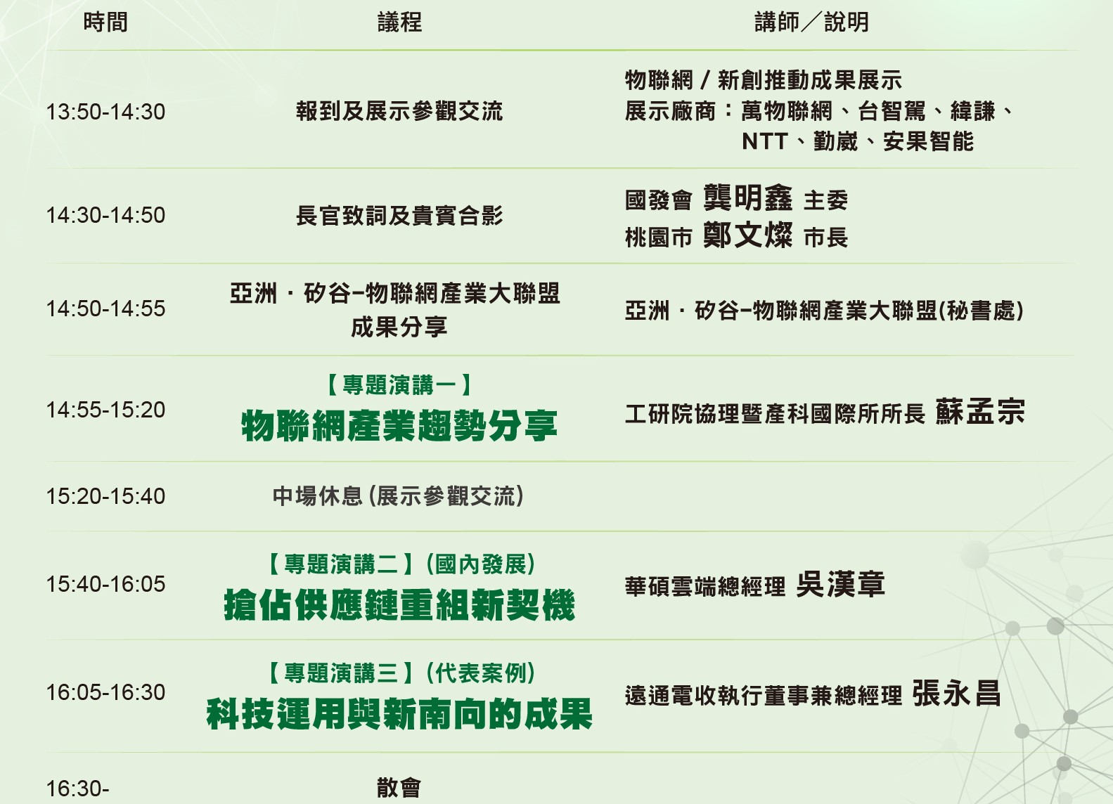 亞洲.矽谷計畫執行中心將於2022年4月27日舉辦「2022物聯網產業大聯盟年會暨智慧物聯國際論壇」,敬邀國發會龔明鑫主委、桃園市市長鄭文燦致詞,工研院、華碩雲端及遠通電收貴賓分享物聯網趨勢及相關應用。為促進與會者交流,現場並邀請多家智慧物聯領域廠商展示創新成果。