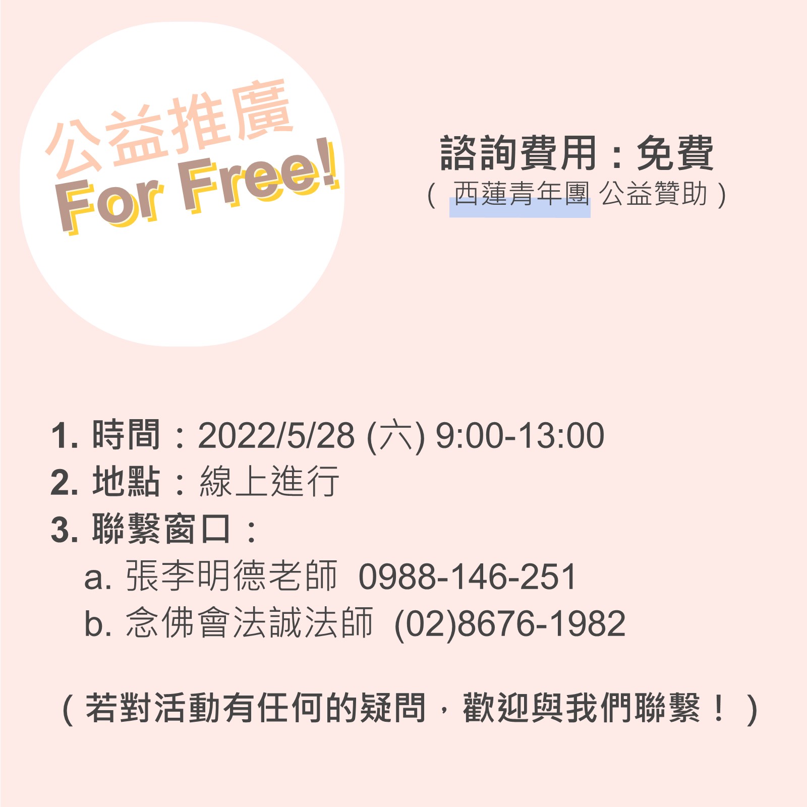 由於是公益諮詢,需麻煩您於諮詢後填寫至少300字的心得、收穫、感想,幫助我持續提供更好的公益服務,謝謝。