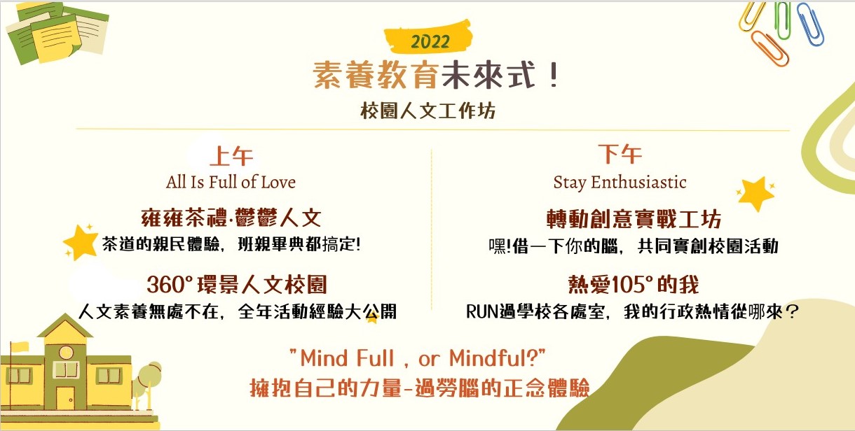 讓我們透過各式想法激盪、教案實作,創造出讓參與的師生、家長裡感動、彼此互動且印象深刻的校園活動吧!