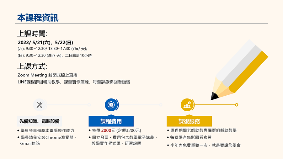 ◆ 本活動採線上直播教學,將於活動前3-5天發送活動通知到您的信箱,並與您確認上課資訊,請確認報名表中提供的信箱會收到通知