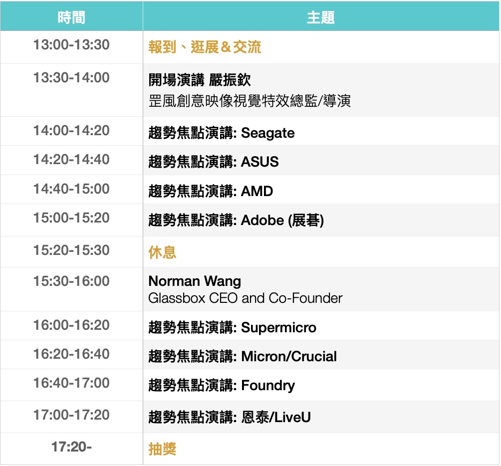 演講區則有金馬獎最佳視覺效果得主嚴振欽擔任開場演講來賓,LED 虛擬製作專家 Norman Wang也會和大家暢談虛擬製作的應用。廠商趨勢分享則有 Adobe、Foundry、Supermicro、Seagate、ASUS、AMD、LiveU、Micron等!