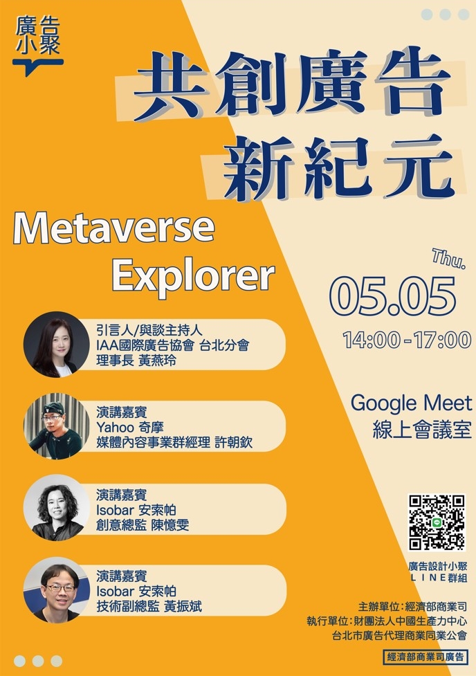 由經濟部商業司主辦,財團法人中國生產力中心、台北市廣告代理商業同業公會共同執行的「廣告小聚-共創廣告新紀元」,希望能藉活動舉辦,增進產業交流,並透過經驗分享為產業帶來正向發展,本年度第一場小聚主題為『Metaverse Explorer』將於05/05 (四) 14:00~17:00於Google Meet線上會議室舉行。
