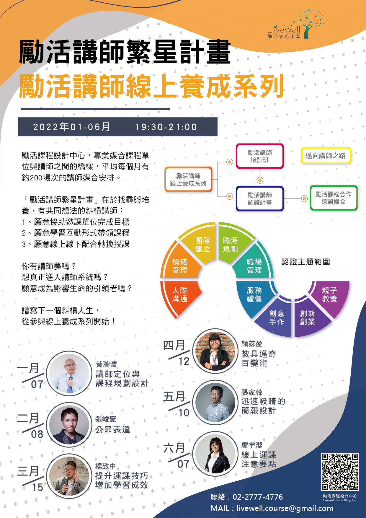 ※ 線上養成系列為分享成為勵活講師重要的授課知識,上完線上課程並非認證完成,5月另行推出認證辦法,僅有參加過線上養成系列課程學員可收到報名資訊 ※