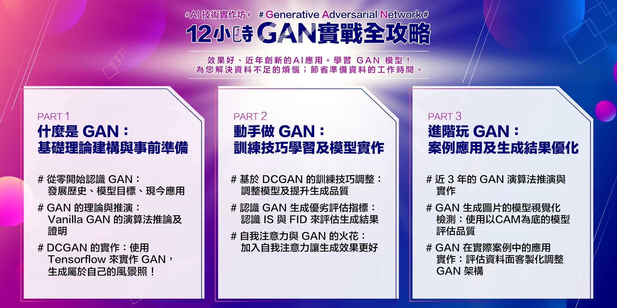 由人工智慧科技基金會 首席資料科學家 蔡源鴻 及 AI 工程師 廖柏瑜,帶領大家學習近3年 GAN 完整的演算法推進歷程及如何應用實作。理解面對不同的資料集,該如何評估 GAN 模型優劣與優化調整,提升生成資料的品質。最後透過實際案例驗證,手把手帶大家實作屬於自己的 GAN,再運用最後生成的資料,加入因資料不足而訓練準確率不高的分類模型,來驗證最後透過 GAN 生成的資料能提高分類模型準確率的結果。